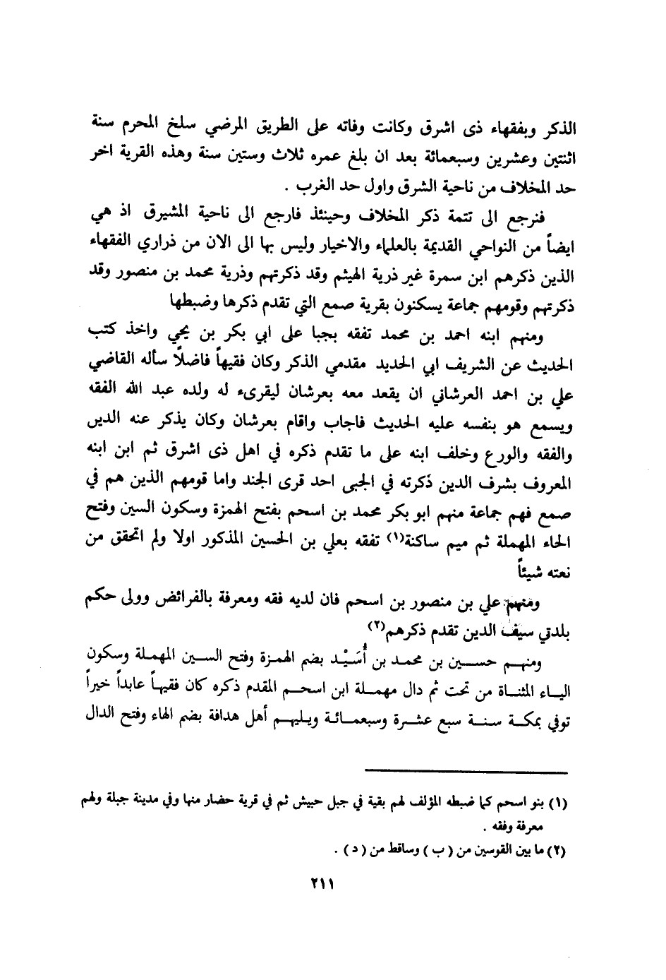وَمِنْهُم ابْنه احْمَد بن مُحَمَّد تفقه بجبا على ى ابي بكر بن يحي واخذ كتب الحَدِيث عَن الشريف ابي الْحَدِيد مقدمي الذّكر وَكَانَ فَقِيها فَاضلا سَأَلَهُ القَاضِي عَليّ بن احْمَد العرشاني ان يقْعد مَعَه بعرشان ليقرئ لَهُ وَلَده عبد الله الْفِقْه وَيسمع هُوَ بِنَفسِهِ عَلَيْهِ الحَدِيث فاجاب واقام بعرشان وَكَانَ يذكر عَنهُ الدّين وَالْفِقْه والورع وَخلف ابْنه على مَا تقدم ذكره فِي اهل ذِي اشرق ثمَّ ابْن ابْنه الْمَعْرُوف بشرف الدّين ذكرته فِي الجبى اُحْدُ قرى الْجند واما قَومهمْ الَّذين هم فِي صمع فهم جمَاعَة مِنْهُم ابو بكر مُحَمَّد بن اسحم بِفَتْح الْهمزَة وَسُكُون السِّين وَفتح الْحَاء الْمُهْملَة ثمَّ مِيم سَاكِنة تفقه بعلي بن الْحُسَيْن الْمَذْكُور اولا وَلم اتحقق من نَعته شَيْئا