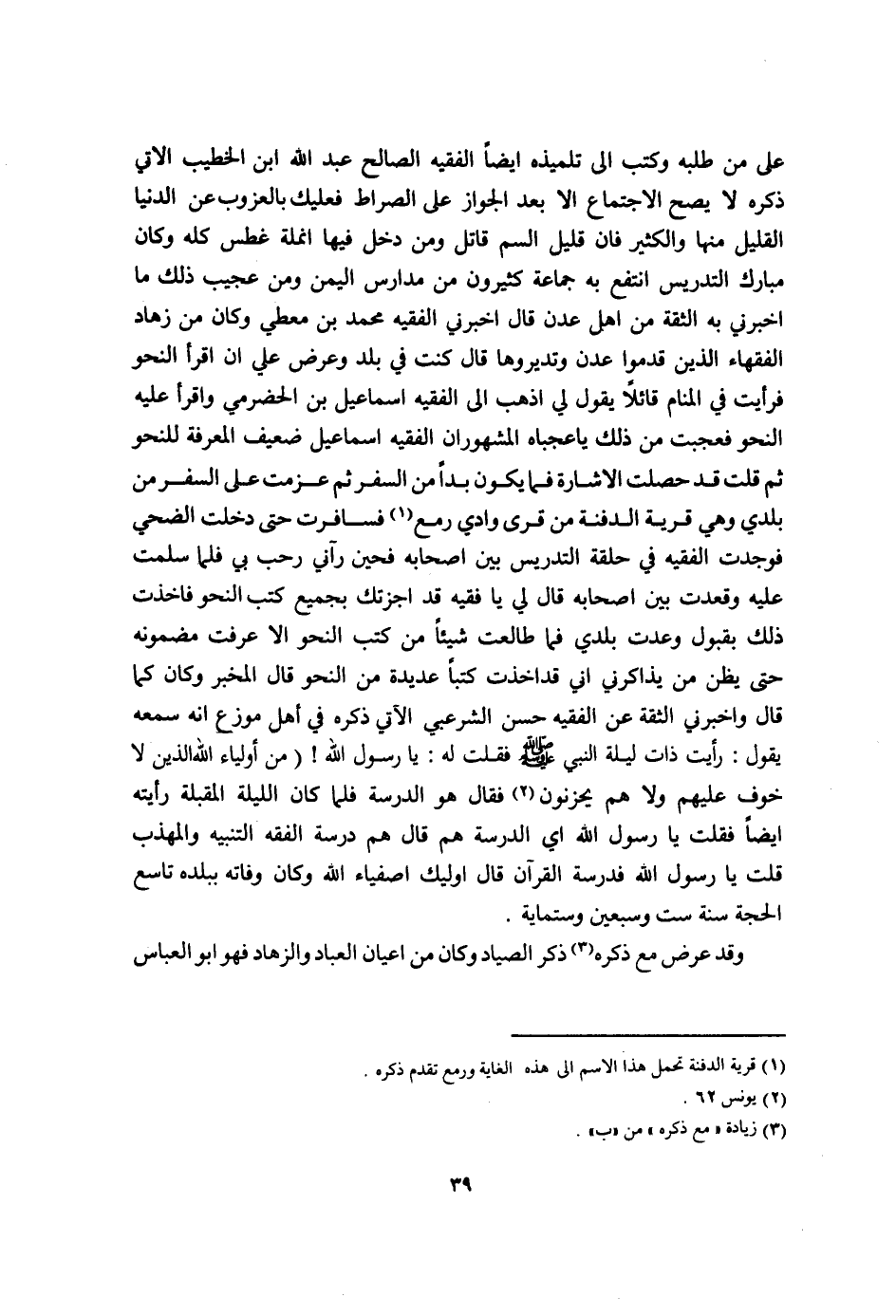 على من طلبه وَكتب الى تِلْمِيذه ايضا الْفَقِيه الصَّالح عبد الله ابْن الْخَطِيب الَّاتِي ذكره لَا يَصح الِاجْتِمَاع الا بعد الْجَوَاز على الصِّرَاط فَعَلَيْك بالعزوب عَن الدُّنْيَا الْقَلِيل مِنْهَا وَالْكثير فان قَلِيل السم قَاتل وَمن دخل فِيهَا انملة غطس كُله وَكَانَ مبارك التدريس انْتفع بِهِ جمَاعَة كَثِيرُونَ من مدارس الْيمن وَمن عَجِيب ذَلِك مَا اخبرني بِهِ الثِّقَة من اهل عدن قَالَ اخبرني الْفَقِيه مُحَمَّد بن معطي وَكَانَ من زهاد الْفُقَهَاء الَّذين قدمُوا عدن وتديروها قَالَ كنت فِي بلد وَعرض عَليّ ان اقْرَأ النَّحْو فَرَأَيْت فِي الْمَنَام قَائِلا يَقُول لي اذْهَبْ الى الْفَقِيه اسماعيل بن الْحَضْرَمِيّ واقرأ عَلَيْهِ النَّحْو فعجبت من ذَلِك يَا عجباه المشهوران الْفَقِيه اسماعيل ضَعِيف الْمعرفَة للنحو ثمَّ قلت قد حصلت الاشارة فَمَا يكون بدا من السّفر ثمَّ عزمت على السّفر من بلدي وَهِي قَرْيَة الدفنة من قرى وَادي رمع فسافرت حَتَّى دخلت الضحي فَوجدت الْفَقِيه فِي حَلقَة التدريس بَين أَصْحَابه فحين رَآنِي رحب بِي فَلَمَّا سَمِعت عَلَيْهِ بِقبُول قعدت بَين اصحابه قَالَ لي يَا فَقِيه قد اجزتك بِجَمِيعِ كتب النَّحْو فاخذت ذَلِك وعدت بلدي فَمَا طالعت شَيْئا من كتب النَّحْو الا عرفت مضمونه حَتَّى يظنّ من يذاكرني اني قد اخذت كتبا عديدة من النَّحْو قَالَ الْمخبر وَكَانَ كَمَا قَالَ واخبرني الثِّقَة عَن الْفَقِيه حسن الشرعبي الْآتِي ذكره فِي أهل موزع انه سَمعه يَقُول رَأَيْت ذَات لَيْلَة النَّبِي صلى الله عَلَيْهِ وَسلم فَقلت لَهُ يَا رَسُول الله من أَوْلِيَاء الله الَّذين لَا خوف عَلَيْهِم وَلَا هم يَحْزَنُونَ فَقَالَ هُوَ الدرسة فَلَمَّا كَانَ اللَّيْلَة الْمُقبلَة رايته أَيْضا فَقلت يَا رَسُول الله أَي الدرسة هم قَالَ هم درسة الْفِقْه التَّنْبِيه والمهذب قلت يَا رَسُول الله فدرسة الْقُرْآن قَالَ اوليك اصفياء الله وَكَانَ وَفَاته بِبَلَدِهِ تَاسِع الْحجَّة سنة سِتّ وَسبعين وستماية