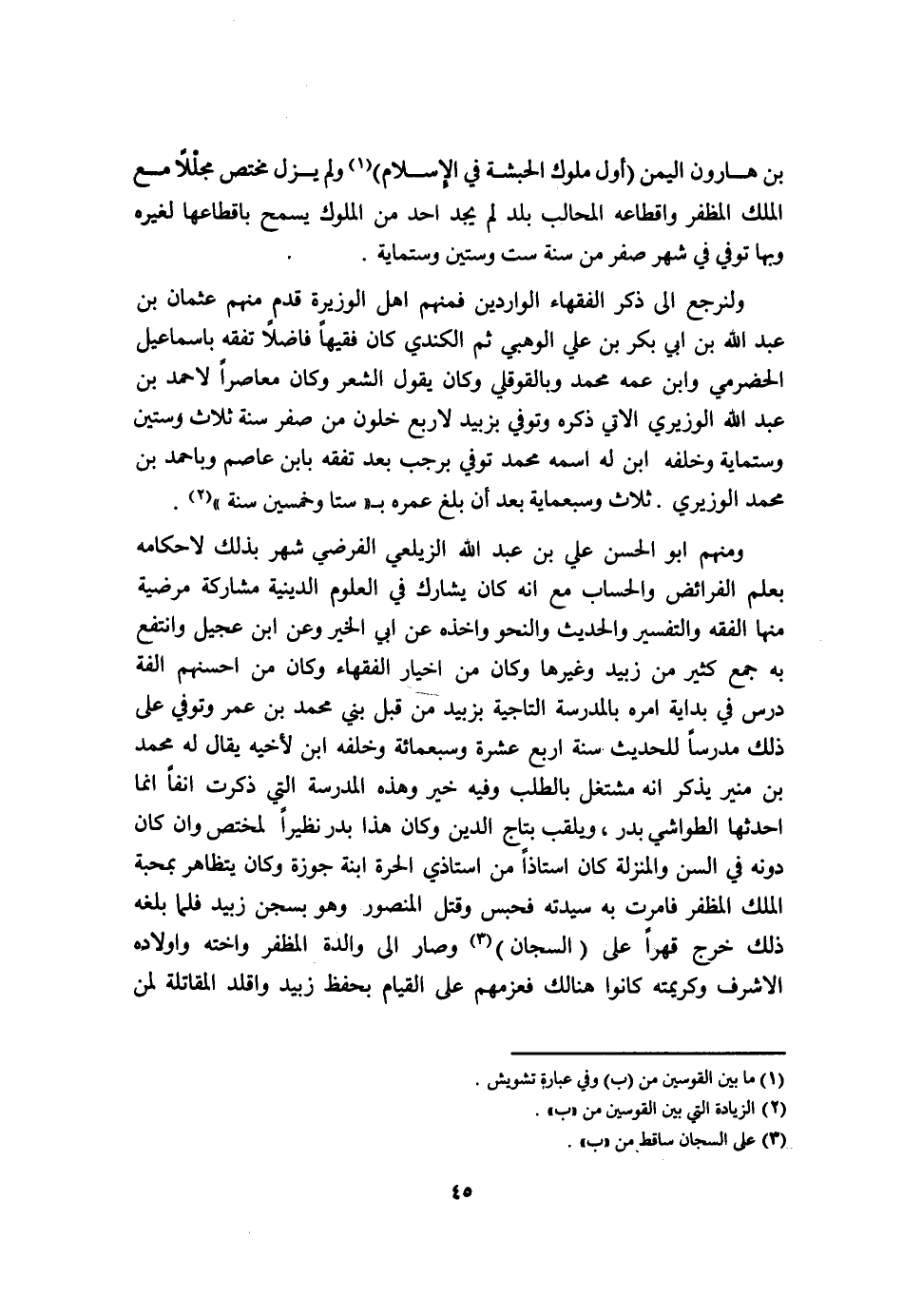 بن هَارُون الْيمن أول مُلُوك الْحَبَشَة فِي الْإِسْلَام وَلم يزل مُخْتَصّ مجللا مَعَ الْملك المظفر واقطاعه المحالب بلد لم يجد اُحْدُ من الْمُلُوك يسمح باقطاعها لغيره وبهاتوفي فِي شهر صفر من سنة سِتّ وَسِتِّينَ وستماية ولنرجع الى ذكر الْفُقَهَاء الواردين فَمنهمْ اهل الوزيرة قدم مِنْهُم عُثْمَان بن عبد الله بن ابي بكر بن عَليّ الْوَهْبِي ثمَّ الْكِنْدِيّ كَانَ فَقِيها فَاضلا تفقه باسماعيل الْحَضْرَمِيّ وَابْن عَمه مُحَمَّد وبالقوقلي وَكَانَ يَقُول الشّعْر وَكَانَ معاصرا لاحمد بن عبد الله الوزيري الَّاتِي ذكره وَتُوفِّي بزبيد لاربع خلون من صفر سنة ثَلَاث وَسِتِّينَ وستماية وَخَلفه ابْن لَهُ اسْمه مُحَمَّد توفّي برجب بعد تفقه بِابْن عَاصِم وباحمد بن مُحَمَّد الوزيري