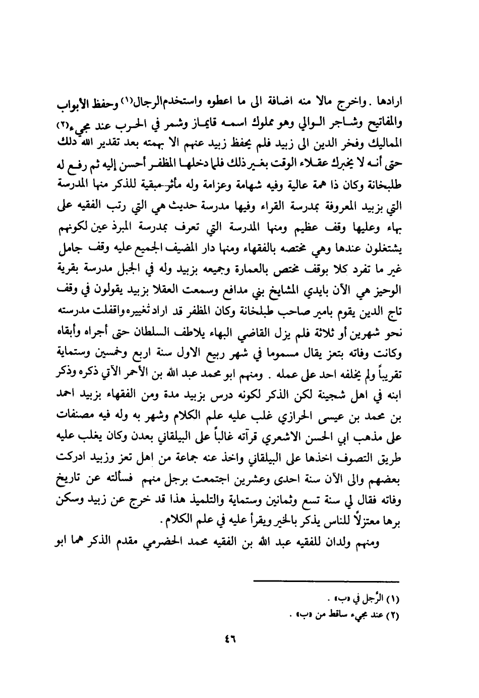وَمِنْهُم ابو مُحَمَّد عبد الله بن الْأَحْمَر الْآتِي ذكره وَذكر ابْنه فِي اهل شجينة لَكِن الذّكر لكَونه درس بزبيد مُدَّة وَمن الْفُقَهَاء بزبيد احْمَد بن مُحَمَّد بن عِيسَى الْحرَازِي غلب عَلَيْهِ علم الْكَلَام وَشهر بِهِ وَله فِيهِ مصنفات على مَذْهَب ابي الْحسن الاشعري قرآته غَالِبا على البيلقاني بعدن وَكَانَ يغلب عَلَيْهِ طَرِيق التصوف اخذها على البيلقانيواخذ عَنهُ جمَاعَة من اهل تعز وزبيد ادركت بَعضهم والى الْآن سنة احدى وَعشْرين اجْتمعت بِرَجُل مِنْهُم فَسَأَلته عَن تَارِيخ وَفَاته فَقَالَ لي سنة تسع وَثَمَانِينَ وستماية والتلميذ هَذَا قد خرج عَن زبيد وَسكن برهَا مُعْتَزِلا للنَّاس يذكر بِالْخَيرِ وَيقْرَأ عَلَيْهِ فِي علم الْكَلَام