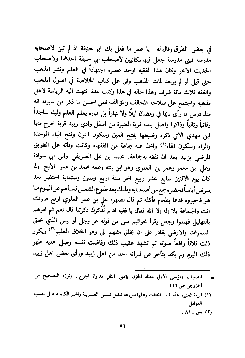 فِي بعض الطّرق وَقَالَ لَهُ يَا عمر مَا فعل بك ابو حنيفَة اذ لم تبن لاصحابه مدرسة فَبنى مدرسة جعل فِيهَا مكانيين لأَصْحَاب ابي حنيفَة أَحدهمَا ولاصحاب الحَدِيث الاخر وَكَانَ هَذَا الْفَقِيه اوحد عصره اجْتِهَادًا فِي الْعلم وَنشر الْمَذْهَب حَتَّى قيل لَو لم يُوجد لمات الْمَذْهَب واتى على كتاب الْخُلَاصَة فِي اصول الْمَذْهَب وَالْفِقْه ثَلَاث مائَة شرف وَهَذَا حَاله فِي هَذَا وَكتب عدَّة انْتَهَت اليه الرياسة لاهل مذْهبه وَاجْتمعَ على صَلَاحه الْمُخَالف والمؤالف فَمن احسن مَا ذكر من سيرته انه مُنْذُ درس مَا رأى نايما فِي رَمَضَان لَيْلًا وَلَا نَهَارا بل نَهَاره يعلم الْعلم وليله سَاجِدا وَقَائِمًا وتاليا وذاكرا وَاصل بَلَده قَرْيَة العنبرة من اسفل وَادي زبيد قَرْيَة خرج مِنْهَا ابْن مهْدي الَّاتِي ذكره وضبطها بِفَتْح الْعين وَسُكُون النُّون وفتحالباء الْمُوَحدَة ولاراء وَسُكُون الْهَاء واخذ عَنهُ جمَاعَة من الْفُقَهَاء وَكَانَت وَفَاته على الطَّرِيق المرضي بزبيد بعد ان تفقه بِهِ جمَاعَة