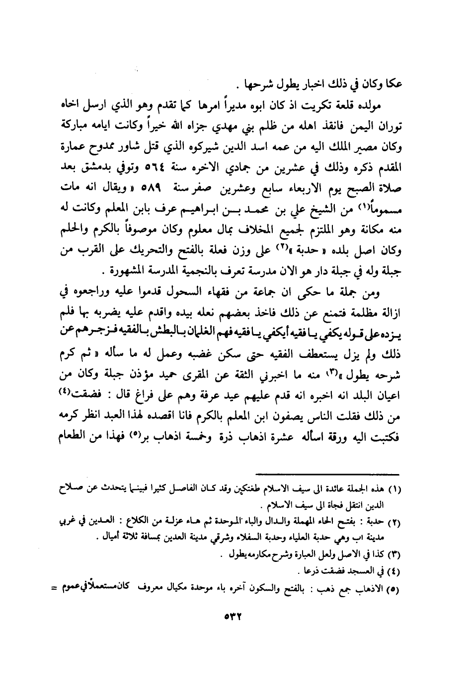 وَمن جملَة مَا حكى ان جمَاعَة من فُقَهَاء السحول قدمُوا عَلَيْهِ وراجعوه فِي ازالة مظْلمَة فتمنع عَن ذَلِك فاخذ بَعضهم نَعله بِيَدِهِ واقدم عَلَيْهِ يضْربهُ بهَا فَلم يزده على قَوْله يَكْفِي يَا فَقِيه أيكفي يَا فَقِيه فهم الغلمان بالبطش بالفقيه فزجرهم عَن ذَلِك وَلم يزل يستعطف الْفَقِيه حَتَّى سكن غَضَبه وَعمل لَهُ مَا سَأَلَهُ ثمَّ كرم شَرحه يطول مِنْهُ مَا اخبرني الثِّقَة عَن المقرى حميد مُؤذن جبلة وَكَانَ من اعيان الْبَلَد انه اخبره انه قدم عَلَيْهِم عيد عَرَفَة وهم على فرَاغ قَالَ فضقت من ذَلِك فَقلت النَّاس يصفونَ ابْن الْمعلم بِالْكَرمِ فانا اقصده لهَذَا العَبْد انْظُر كرمه فَكتبت اليه ورقة اسأله عشرَة اذهاب ذرة وَخَمْسَة اذهاب بر فَهَذَا من الطَّعَام