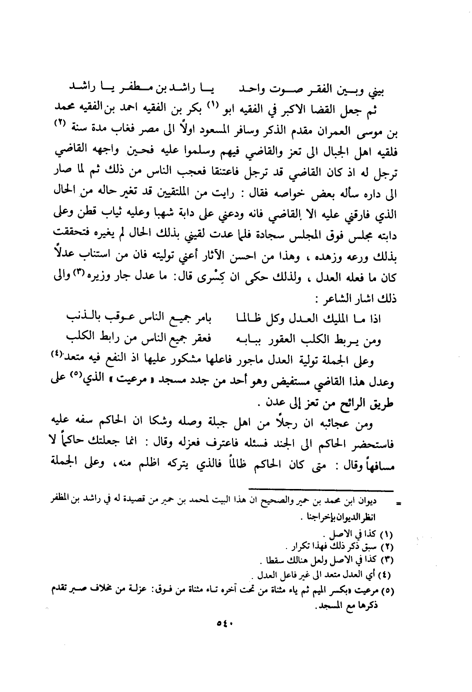 .. بيني وَبَين الْفقر صَوت وَاحِد ... يَا رَاشد بن مطفر يَا رشاد ... ثمَّ جعل القضا الاكبر فِي الْفَقِيه ابو بكر بن الْفَقِيه احْمَد بن الْفَقِيه مُحَمَّد بن مُوسَى الْعمرَان مقدم الذّكر وسافر المسعود اولا الى مصر فَغَاب مُدَّة سنة فَلَقِيَهُ أهل الْجبَال الى تعز وَالْقَاضِي فيهم وسلموا عَلَيْهِ فحين واجهه القَاضِي ترجل لَهُ اذ كَانَ القَاضِي قد ترجل فاعتنقا فَعجب النَّاس من ذَلِك ثمَّ لما صَار الى دَاره سَأَلَهُ بعض خواصه فَقَالَ رايت من الملتقيين قد تغير حَاله من الْحَال الَّذِي فارقني عَلَيْهِ الا القَاضِي فانه وَدعنِي على دَابَّة شهبا وَعَلِيهِ ثِيَاب قطن وعَلى دَابَّته مجْلِس فَوق الْمجْلس سجادة فَلَمَّا عدت لَقِيَنِي بذلك الْحَال لم يُغَيِّرهُ فتحققت بذلك ورعه وزهده وَهَذَا من احسن الاثار أَعنِي تَوليته فان من استناب عدلا كَانَ مَا فعله الْعدْل وَلذَلِك حكى ان كسْرَى قَالَ مَا عدل جَار وزيره والى ذَلِك اشار الشَّاعِر ... اذا مَا المليك الْعدْل وكل ظَالِما ... بِأَمْر جَمِيع النَّاس عُوقِبَ بالذنب