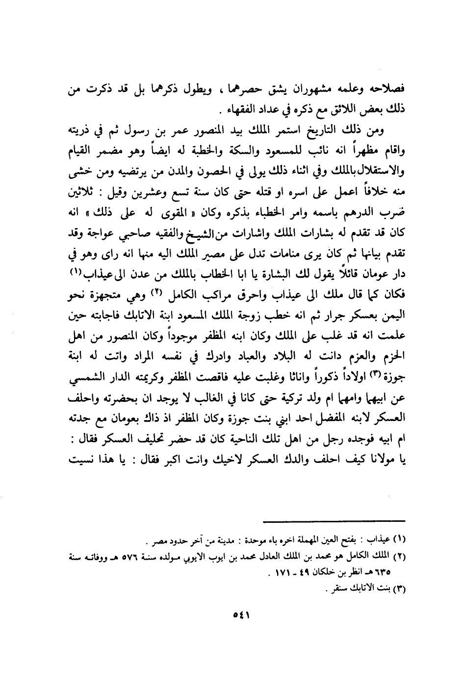 وَمن ذَلِك التَّارِيخ اسْتمرّ الْملك بيد الْمَنْصُور عمر بن رَسُول ثمَّ فِي ذُريَّته واقام مظْهرا انه نَائِب للمسعود وَالسِّكَّة وَالْخطْبَة لَهُ ايضا وَهُوَ مُضْمر الْقيام والاستقلال بِالْملكِ وَفِي اثناء ذَلِك يُولى فِي الْحُصُون والمدن من يرتضيه وَمن خشى مِنْهُ خلافًا اعْمَلْ على اسره اَوْ قَتله حَتَّى كَانَ سنة تسع وَعشْرين وَقيل ثَلَاثِينَ ضرب الدِّرْهَم باسمه وَأمر الخطباء بِذكرِهِ وَكَانَ المقوى لَهُ على ذَلِك انه كَانَ قد تقدم لَهُ بشارات الْملك وأشارات من الشَّيْخ والفقيه صَاحِبي عواجة وَقد تقدم بَيَانهَا ثمَّ كَانَ يرى منامات تدل على مصير الْملك اليه مِنْهَا انه رأى وَهُوَ فِي دَار عومان قَائِلا يَقُول لَك الْبشَارَة يَا أَبَا الْخطاب بِالْملكِ من عدن الى عيذاب فَكَانَ كَمَا قَالَ ملك الى عيذاب وأحرق مراكب الْكَامِل وَهِي متجهزة نَحْو الْيمن بعسكر جرار ثمَّ انه خطب زَوْجَة الْملك المسعود ابْنة الاتابك فاجابته حِين علمت انه قد غلب على الْملك وَكَانَ ابْنه المظفر مَوْجُودا وَكَانَ الْمَنْصُور من أهل الحزم والعزم دَانَتْ لَهُ الْبِلَاد والعباد وادرك فِي نَفسه المُرَاد وَأَتَتْ لَهُ ابْنة جوزة اولادا ذُكُورا واناثا وغلبت عَلَيْهِ فاقصت المظفر وكريمته الدَّار الشمسي عَن أَبِيهِمَا وأمهما ام ولد تركية حَتَّى كَانَا فِي الْغَالِب لَا يُوجد ان بِحَضْرَتِهِ وأحلف الْعَسْكَر لِابْنِهِ الْمفضل أحد ابْني بنت جوزة وَكَانَ المظفر اذ ذَاك بعومان مَعَ جدته أم ابيه فَوَجَدَهُ رجل من أهل تِلْكَ النَّاحِيَة كَانَ قد حضر تَحْلِيف الْعَسْكَر فَقَالَ يَا مَوْلَانَا كَيفَ أَحْلف والدك الْعَسْكَر لاخيك وانت أكبر فَقَالَ يَا هَذَا نسيت