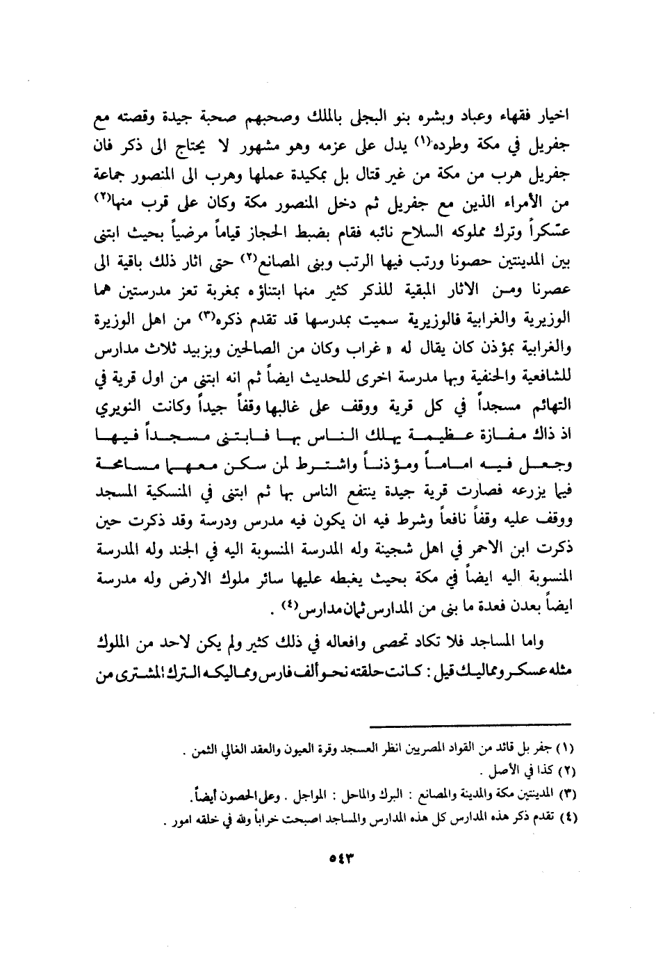 اخيار فُقَهَاء وَعباد وبشره بَنو البَجلِيّ بِالْملكِ وصحبهم صُحْبَة جَيِّدَة وقصته مَعَ جفريل فِي مَكَّة وطرده يدل على عزمه وَهُوَ مَشْهُور لَا يحْتَاج الى ذكر فَإِن جفريل هرب من مَكَّة من غير قتال بل بمكيدة عَملهَا وهرب الى الْمَنْصُور جمَاعَة من الْأُمَرَاء الَّذين مَعَ جفريل ثمَّ دخل الْمَنْصُور مَكَّة وَكَانَ على قرب مِنْهَا عسكرا وَترك مَمْلُوكه السِّلَاح نَائِبه فَقَامَ بضبط الْحجاز قيَاما مرضيا بِحَيْثُ ابتنى بَين المدينتين حصونا ورتب فِيهَا الرتب وَبنى المصانع حَتَّى أثار ذَلِك بَاقِيَة الى عصرنا وَمن الاثار المبقية للذّكر كثير مِنْهَا ابتناؤه بمغربة تعز مدرستين هما الوزيرية والغرابية فالوزيرية سميت بمدرسها قد تقدم ذكره من أهل الوزيرة والغرابية بمؤذن كَانَ يُقَال لَهُ عزاب وَكَانَ من الصَّالِحين وبزبيد ثَلَاث مدارس للشَّافِعِيَّة وَالْحَنَفِيَّة وَبهَا مدرسة أُخْرَى للْحَدِيث ايضا ثمَّ إنهابتنى من أول قَرْيَة فِي التهائم مَسْجِدا فِي كل قَرْيَة ووقف على غالبها وَقفا جيدا وَكَانَت النويري اذ ذَاك مفازة عَظِيمَة يهْلك النَّاس بهَا فابتنى مَسْجِدا فِيهَا وَجعل فِيهِ اماما ومؤذنا وَاشْترط لمن سكن مَعَهُمَا مُسَامَحَة فِيمَا يزرعه فَصَارَت قَرْيَة جَيِّدَة ينْتَفع النَّاس بهَا ثمَّ ابتنى فِي المنسكية الْمَسْجِد ووقف عَلَيْهِ وَقفا نَافِعًا وَشرط فِيهِ أَن يكون فِيهِ مدرس ودرسة وَقد ذكرت حِين ذكرت ابْن الاحمر فِي أهل شجينة وَله الْمدرسَة المنسوبة اليه فِي الْجند وَله الْمدرسَة المنسوبة اليه ايضا فِي مَكَّة بِحَيْثُ يغبطه عَلَيْهَا سَائِر مُلُوك الارض وَله مدرسة ايضا بعدن فَعدَّة مَا بنى من الْمدَارِس ثَمَان مدارس