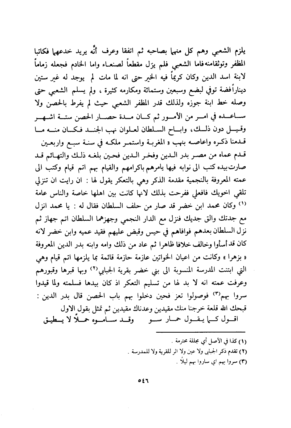 يلْزم الشّعبِيّ وهم كل مِنْهُمَا بِصَاحِبِهِ ثمَّ اتفقَا وَعرف أَنه يُرِيد خدعهما فكاتبا المظفر وتوثقا مِنْهُ فَأَما الشّعبِيّ فَلم يزل مقطعا لصنعاء وَأما الْخَادِم فَجعله زماما لابنَة اسد الدّين وَكَانَ كَرِيمًا فِيهِ الْخَيْر حَتَّى انه لما مَاتَ لم يُوجد لَهُ غير سِتِّينَ دِينَارا فضَّة توفّي لبضع وَسبعين وسِتمِائَة ومكارمه كَثِيرَة وَلم يسلم الشّعبِيّ حَتَّى وَصله خطّ ابْنة جوزه وَلذَلِك قدر المظفر الشّعبِيّ حَيْثُ لم يفرط بالحصن وَلَا ساعده فِي أَمر من الْأُمُور ثمَّ كَانَ مُدَّة حِصَار الْحصن سِتَّة أشهر وَقيل دون ذَلِك وأباح السُّلْطَان لعلوان نهب الْجند فَكَانَ مِنْهُ مَا قدمنَا ذكره واعاصه بِنَهْب المغربة وَاسْتمرّ ملكه فِي سنة سبع واربعين قدم عماه من مصر بدر الدّين وفخر الدّين فحين بلغه ذَلِك والتهائم قد صَارَت بِيَدِهِ كتب الى نوابه فِيهَا يَأْمُرهُم باكرامهم وَالْقِيَام بهم اتم قيام وَكتب الى عمته الْمَعْرُوفَة بالنجمية مُقَدّمَة الذّكر وَهِي بالتعكر يَقُول لَهَا ان رَأَيْت ان تنزلي تلقي اخويك فافعلي فَفَرِحت بذلك لانها كَانَت بَين اهلها خَاصَّة وَالنَّاس عَامَّة وَكَانَ مُحَمَّد ابْن خضر قد صَار من حلف السُّلْطَان فَقَالَ لَهُ يَا مُحَمَّد انْزِلْ مَعَ جدتك والق جديك فَنزل مَعَ الدَّار النجمي وجهزهما السُّلْطَان اتم جهاز ثمَّ نزل السُّلْطَان بعدهمْ فوافاهم فِي حيس وَقبض عَلَيْهِم فقيد عميه وَابْن خضر لانه كَانَ قد أسأوا وَخَالف خلافًا ظَاهرا ثمَّ عَاد من ذَلِك وَأمه وَابْنه بدر الدّين الْمَعْرُوفَة بزهرا وَكَانَت من أَعْيَان الخواتين عازمة حازمة قَائِمَة بِمَا يلْزمهَا اتم قيام وَهِي الَّتِي ابتنت الْمدرسَة المنسوبة الى بني خضر بقرية الجبابي وَبهَا قبرها وقبورهم وَعرفت عمته انه لَا بُد لَهَا من تَسْلِيم التعكر اذ كَانَ بِيَدِهَا فسلمته وَلما قيدوا سروا بهم فوصولوا لَا تعز فحين دخلُوا بهم بَاب الْحصن قَالَ بدر الدّين قبحك الله قلعة خرجنَا مِنْك مقيدين وعدناك مقيدين ثمَّ تمثل بقول الاول ... اقول كَمَا يَقُول حمَار سو ... وَقد ساموه حملا لَا يُطيق ...