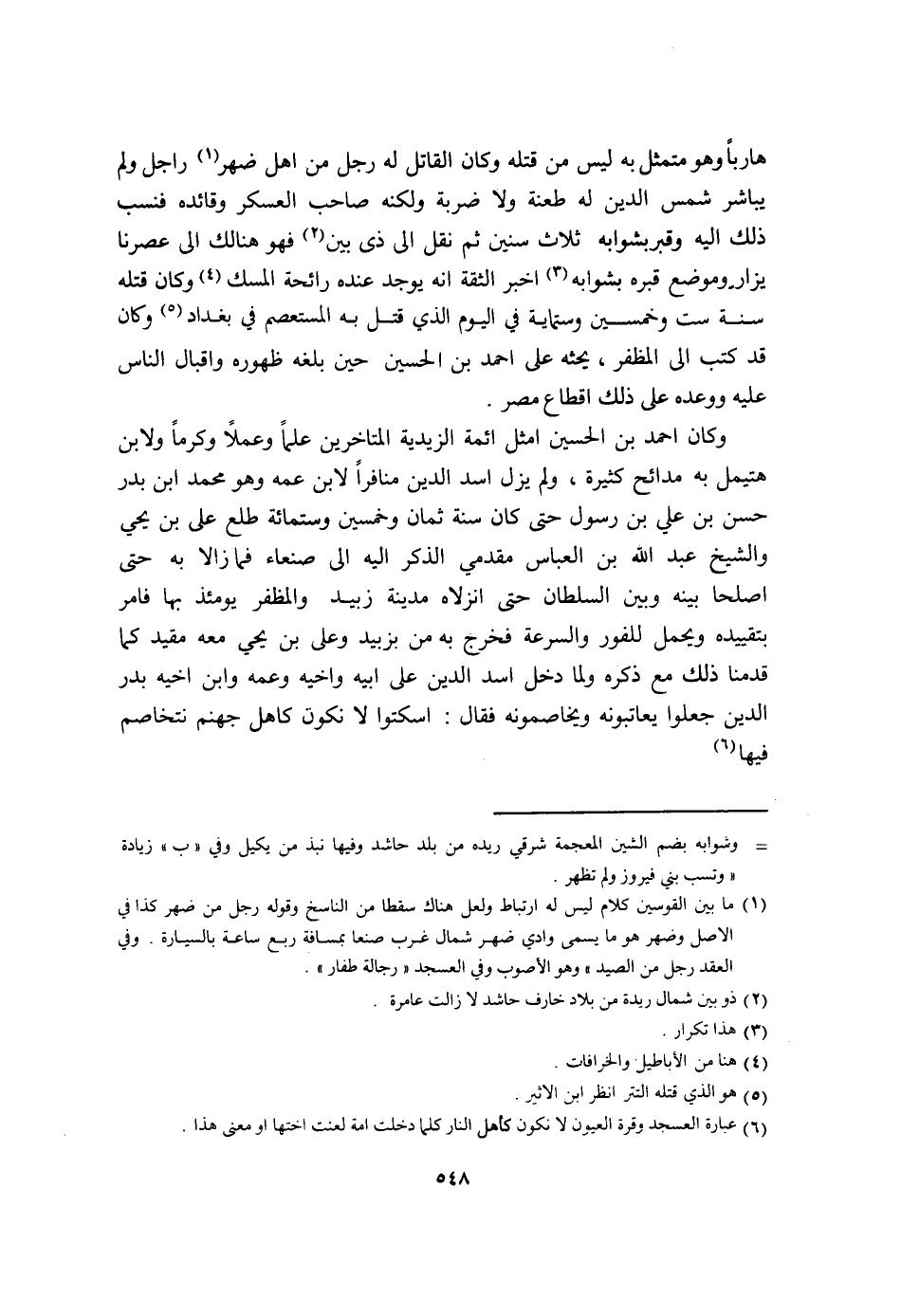 وَكَانَ احْمَد بن الْحُسَيْن امثل ائمة الزيدية الْمُتَأَخِّرين علما وَعَملا وكرما وَلابْن هتيمل بِهِ مدائح كَثِيرَة وَلم يزل اسد الدّين منافرا لِابْنِ عَمه وَهُوَ مُحَمَّد ابْن بدر حسن بن عَليّ بن رَسُول حَتَّى كَانَ سنة ثَمَان وَخمسين وسِتمِائَة طلع عَليّ بن يحي وَالشَّيْخ عبد الله بن الْعَبَّاس مقدمي الذّكر اليه الى صنعاء فَمَا زَالا بِهِ حَتَّى اصلحا بَينه وَبَين السُّلْطَان حَتَّى انزلاه مَدِينَة زبيد والمظفر يَوْمئِذٍ بهَا فَأمر بتقييده وَيحمل للفور والسرعة فَخرج بِهِ من بزبيد وعَلى بن يحي مَعَه مُقَيّد كَمَا قدمنَا ذَلِك مَعَ ذكره وَلما دخل اسد الدّين على ابيه واخيه وَعَمه وَابْن اخيه بدر الدّين جعلُوا يعاتبونه ويخاصمونه فَقَالَ اسْكُتُوا لَا نَكُون كَاهِل جَهَنَّم نتخاصم فِيهَا