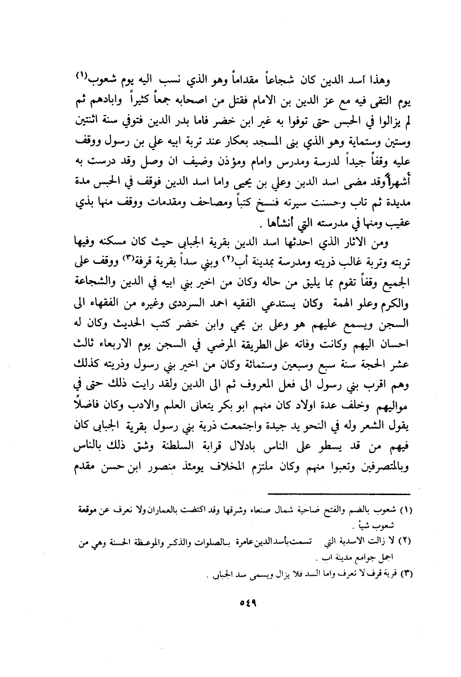 وَهَذَا أَسد الدّين كَانَ شجاعا مقداما وَهُوَ الَّذِي نسب اليه يَوْم شعوب يَوْم التقى فِيهِ مَعَ عز الدّين بن الامام فَقتل من أَصْحَابه جمعا كثيرا وابادهم ثمَّ لم يزَالُوا فِي الْحَبْس حَتَّى توفوا بِهِ غير ابْن خضر فاما بدر الدّين فَتوفي سنة اثْنَتَيْنِ وَسِتِّينَ وستماية وَهُوَ الَّذِي بنى الْمَسْجِد بعكار عِنْد تربة ابيه عَليّ بن رَسُول ووقف عَلَيْهِ وَقفا جيدا لدرسة ومدرس وامام ومؤذن وضيف ان وصل وَقد درست بِهِ أشهرا وَقد مضى اسد الدّين وَعلي بن يحيى وَأما اسد الدّين فَوقف فِي الْحَبْس مُدَّة مديدة ثمَّ تَابَ وَحسنت سيرته فنسخ كتبا ومصاحف ومقدمات ووقف مِنْهَا بِذِي عقيب وَمِنْهَا فِي مدرسته الَّتِي أَنْشَأَهَا