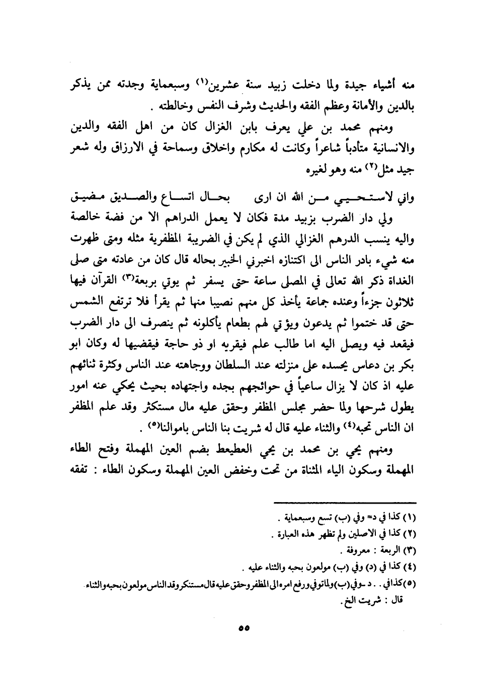وَمِنْهُم مُحَمَّد بن عَليّ يعرف بِابْن الغزال كَانَ من اهل الْفِقْه وَالدّين والانسانية متأدبا شَاعِرًا وَكَانَت لَهُ مَكَارِم واخلاق وسماحة فِي الارزاق وَله شهر جيد مثل مِنْهُ وَهُوَ لغيره ... واني لاستحيي من الله ان ارى ... بِحَال اتساع وَالصديق مضيق ... ولي دَار الضَّرْب بزبيد مدى فَكَانَ لَا يعْمل الدَّرَاهِم الا من فضَّة خَالِصَة واليه ينْسب الدِّرْهَم الْغَزالِيّ الَّذِي لم يكن فِي الضريبة المظفرية مثله وَمَتى ظَهرت مِنْهُ شَيْء بَادر النَّاس الى اكتنازة اخبرني الْخَبِير بِحَالهِ قَالَ كَانَ من عَادَته مَتى صلى الْغَدَاة ذكر الله تَعَالَى فِي الْمصلى سَاعَة حَتَّى يسفر ثمَّ يوتي بربعة الْقُرْآن فِيهَا ثَلَاثُونَ جُزْءا وَعِنْده جمَاعَة يَأْخُذ كل مِنْهُ نَصِيبا مِنْهَا ثمَّ يقْرَأ فَلَا ترْتَفع الشَّمْس حَتَّى قد ختموا ثمَّ يدعونَ ويؤتي لَهُم بِطَعَام يَأْكُلُونَهُ ثمَّ ينْصَرف الى دَار الضَّرْب فيقعد فِيهِ ويصل اليه اما طَالب علم فيقريه اَوْ ذُو حَاجَة فيقضيها لَهُ وَكَانَ ابو بكر بن دعاس يحسده على مَنْزِلَته عِنْد السُّلْطَان ووجاهته عِنْد النَّاس وَكَثْرَة ثنائهم عَلَيْهِ اذ كَانَ لَا يزَال ساعيا فِي حوائجهم بجده واجتهاده بِحَيْثُ يَحْكِي عَنهُ امور يطول شرحها وَلما حضر مجْلِس المظفر وحقق عَلَيْهِ مَال مستكثر وَقد علم المظفر ان النَّاس تحبه وَالثنَاء عَلَيْهِ قَالَ لَهُ شريت بِنَا النَّاس باموالنا