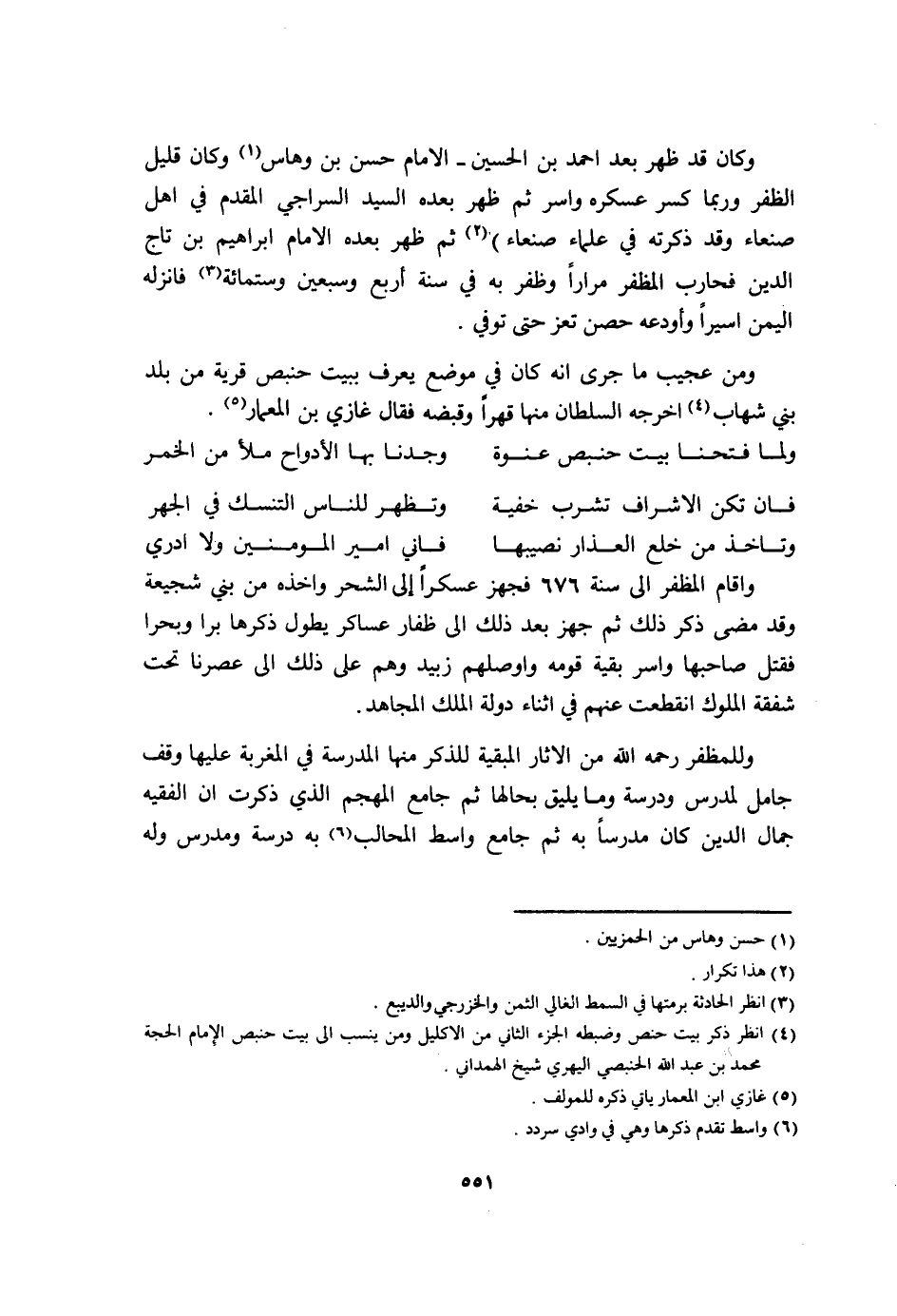 وَكَانَ قد ظهر بعد احْمَد بن الْحُسَيْن الامام حسن بن وهاس وَكَانَ قَلِيل الظفر وَرُبمَا كسر عسكره واسر ثمَّ ظهر بعده السَّيِّد السراجي الْمُقدم فِي أهل صنعاء وَقد ذكرته فِي عُلَمَاء صنعاء ثمَّ ظهر بعده الامام ابراهيم بن تَاج الدّين فحارب المظفر مرَارًا وظفر بِهِ فِي سنة أَربع وَسبعين وسِتمِائَة فانزله الْيمن اسيرا وأودعه حصن تعز حَتَّى توفّي