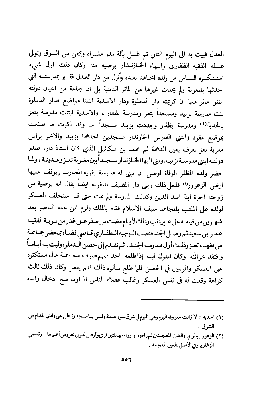 الْعدْل فبيت بِهِ الى الْيَوْم الثَّانِي ثمَّ غسل بألة مدر مشتراه وكفن من السُّوق وَتَوَلَّى غسله الْفَقِيه الظفاري والبهاء الخازندار بِوَصِيَّة مِنْهُ وَكَانَ ذَلِك أول شَيْء استنكره النَّاس من وَلَده الْمُجَاهِد بعده وَأنزل من دَار الْعدْل فقبر بمدرسته الَّتِي احدثها بالمغربة وَلم يحدث غَيرهَا من المأثر الدِّينِيَّة بل ان جمَاعَة من اعيان دولته ابْتَنَوْا مآثر مِنْهَا ان كريمته دَار الدملوة وَدَار الاسدية ابتنتا مَوَاضِع فدار الدملوة بنت مدرسة بزبيد ومسجدا بتعز ومدرسة بظفار والاسدية ابتنت مدرسة بتعز بالحدبة ومدرسة بظفار وجددت بزبيد مَسْجِدا بهَا وَقد ذكرت مَا صنعت بِموضع مُفْرد وابتنى الْفَارِس الخازندار مسجدين أَحدهمَا بزبيد والاخر براس مغربة تعز تعرف بِعَين الدهمة ثمَّ مُحَمَّد بن مِيكَائِيل الَّذِي كَانَ استاذ دَاره صدر دولته ابتني مدرسة بزبيد وَبني البها الخازندا مَسْجِدا بَين مغربة تعز وعدينة وَلما حضر وَلَده المظفر الْوَفَاة اوصى ان يَبْنِي لَهُ مدرسة بقرية الْمُحَارب وَيُوقف عَلَيْهَا ارْض الزعرور فَفعل ذَلِك وَبنى دَار المضيف بالمغربة اياض يُقَال أَنه بِوَصِيَّة من ززوجته الْحرَّة ابْنة اسد الدّين وَكَذَلِكَ الْمدرسَة وَلم يمت حَتَّى قد اسْتحْلف الْعَسْكَر لوَلَده على الملقب الْمُجَاهِد سيف الاسلام فَقَامَ بِالْملكِ وَلزِمَ ابْن عَمه النَّاصِر بعد شَهْرَيْن من قِيَامه على غير ذَنْب وَذَلِكَ لأيام مَضَت من صفر على غدر من تربة الْفَقِيه عمر بن سعيد ثمَّ وصل الْجند فنصب الْوَجِيه الظفاري قَاضِي قُضَاة بِمحضر جمَاعَة من فُقَهَاء تعز وَذَلِكَ أول قدومه الْجند ثمَّ تقدم الى حصن الدملوة ولبث بِهِ أَيَّامًا وافتقد خزائنه وَكَانَ الْمُلُوك قبله إِذا طلعه اُحْدُ مِنْهُم صرف مِنْهُ جملَة مَال مستكثرة على الْعَسْكَر والمرتبين فِي الْحصن فَلَمَّا طلع سَأَلُوهُ ذَلِك فَلم يفعل وَكَانَ ذَلِك ثَالِث كَرَاهَة وقْعَة لَهُ فِي نفس الْعَسْكَر وغالب عقلاء النَّاس اذ اولها منع ادخال وَالِده