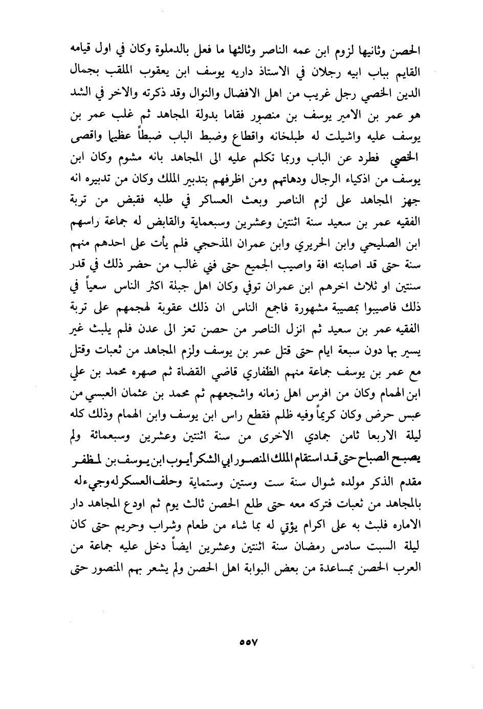 الْحصن وَثَانِيها لُزُوم ابْن عَمه النَّاصِر وَثَالِثهَا مَا فعل بالدملوة وَكَانَ فِي أول قِيَامه القايم بِبَاب ابيه رجلَانِ فِي الاستاذ داريه يُوسُف ابْن يَعْقُوب الملقب بِجَمَال الدّين الْخصي رجل غَرِيب من أهل الافضال والنوال وَقد ذكرته والاخر فِي الشد هُوَ عمر بن الامير يُوسُف بن مَنْصُور فقاما بدولة الْمُجَاهِد ثمَّ غلب عمر بن يُوسُف عَلَيْهِ واشيلت لَهُ طبلخانه واقطاع وَضبط الْبَاب ضبطا عَظِيما واقصى الْخصي فطرد عَن الْبَاب وَرُبمَا تكلم عَلَيْهِ الى الْمُجَاهِد بانه مشرم وَكَانَ ابْن يُوسُف من اذكياء الرِّجَال ودهاتهم وَمن اظرفهم بتدبير الْملك وَكَانَ من تَدْبيره انه جهز الْمُجَاهِد على لزم النَّاصِر وَبعث العساكر فِي طلبه فَقبض من تربة الْفَقِيه عمر بن سعيد سنة اثْنَتَيْنِ وَعشْرين وسبعماية والقابض لَهُ جمَاعَة رَأْسهمْ ابْن الصليحي وَابْن الحريري وَابْن عمرَان المذجحي فَلم يَأْتِ على احدهم مِنْهُم سنة حَتَّى قد اصابته افة واصيب الْجَمِيع حَتَّى فني غَالب من حضر ذَلِك فِي قدر سنتَيْن اَوْ ثَلَاث اخرهم ابْن عمرَان توفّي وَكَانَ اهل جبلة اكثر النَّاس سعيا فِي ذَلِك فاصيبوا بمصيبة مشهروة فاجمع النَّاس ان ذَلِك عُقُوبَة لهجمهم على تربة الْفَقِيه عمر بن سعيد ثمَّ انْزِلْ النَّاصِر من حصن تعز الى عدن فَلم يلبث غير يسير بهَا دون سَبْعَة أَيَّام حَتَّى قتل عمر بن يُوسُف وَلزِمَ الْمُجَاهِد من ثعبات وَقتل مَعَ عمر بن يُوسُف جمَاعَة مِنْهُم الظفاري قَاضِي الْقُضَاة ثمَّ صهره مُحَمَّد بن عَليّ ابْن الْهمام وَكَانَ من افرس اهل زَمَانه واشجعهم ثمَّ مُحَمَّد بن عُثْمَان الْعَبْسِي من عبس حرض وَكَانَ كريم وَفِيه ظلم فَقطع راس ابْن يُوسُف وَابْن الْهمام وَذَلِكَ كُله لَيْلَة الاربعاء ثامن جمادي الاخرى من سنة اثْنَتَيْنِ وَعشْرين وَسَبْعمائة وَلم يصبح الصَّباح حَتَّى قد استقام الْملك الْمَنْصُور ابي الشُّكْر ايوب ابْن يُوسُف بن لمظفر مقدم الذّكر مولده شَوَّال سنة سِتّ وَسِتِّينَ وستماية وَحلف الْعَسْكَر لَهُ وَجِيء لَهُ بالمجاهد من ثعبات فَتَركه مَعَه حَتَّى طلع الْحصن ثَالِث يَوْم ثمَّ اودع الْمُجَاهِد دَار الامارة فَلبث بِهِ على اكرام يُؤْتِي لَهُ بِمَا شَاءَ من طَعَام وشراب وحريم حَتَّى كَانَ لَيْلَة السبت سادس رَمَضَان سنة اثْنَتَيْنِ وَعشْرين ايضا دخل عَلَيْهِ جمَاعَة من الْعَرَب الْحصن بمساعدة من بعض البوابة أهل الْحصن وَلم يشْعر بهم الْمَنْصُور حَتَّى