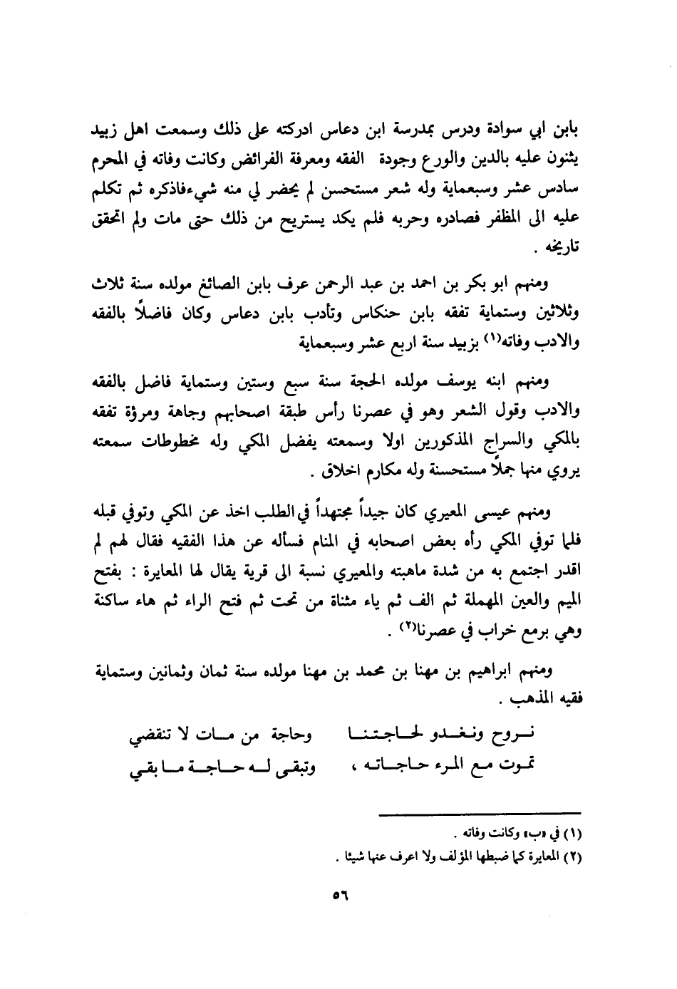 وَمِنْهُم عِيسَى المعيري كَانَ جيدا مُجْتَهدا فِي الطّلب اخذ عَن الْمَكِّيّ وَتُوفِّي قبله فَلَمَّا توفّي الْمَكِّيّ رأه بعض اصحابه فِي الْمَنَام فَسَأَلَهُ عَن هَذَا الْفَقِيه فَقَالَ هَلُمَّ لم اقدر اجْتمع بِهِ من شدَّة ماهبته والمعيري نِسْبَة الى قَرْيَة يُقَال لَهَا المعايرة بِفَتْح الْمِيم وَالْعين االمهلة ثمَّ الف ثمَّ يَاء مثناة من تَحت ثمَّ فتح الرَّاء ثمَّ هَاء سَاكِنة وَهِي برمع خراب فِي عصرنا