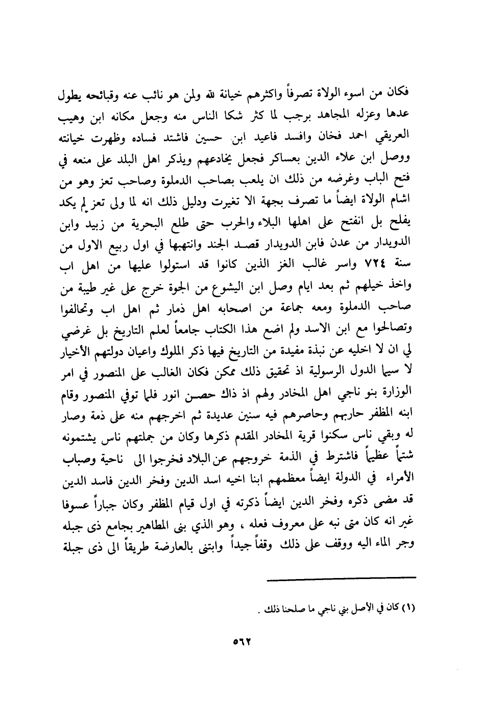 فَكَانَ من اسوء الْوُلَاة تَصرفا وَأَكْثَرهم خِيَانَة لله وَلمن هونائب عَنهُ وقبائحه يطول عدهَا وعزله الْمُجَاهِد برجب لما كثر شكا النَّاس مِنْهُ وَجعل مَكَانَهُ ابْن وهيب العريقي احْمَد فخان وافسد فاعيد ابْن حُسَيْن فَاشْتَدَّ فَسَاده وَظَهَرت خيانته وَوصل ابْن عَلَاء الدّين بعساكر فَجعل يخادعهم وَيذكر أهل الْبَلَد على مَنعه فِي فتح الْبَاب وغرضه من ذَلِك أَن يلْعَب بِصَاحِب الدملوة وَصَاحب تعز وَهُوَ من اشام الْوُلَاة ايضا مَا تصرف بِجِهَة الا تَغَيَّرت وَدَلِيل ذَلِك أَنه لما ولى تعز لم يكد يفلح بل انْفَتح على أَهلهَا الْبلَاء وَالْحَرب حَتَّى طلع البحرية من زبيد وَابْن الدويدار من عدن فَابْن الدويدار قصد الْجند وانتهبها فِي أول ربيع الاول من سنة 724 واسر غَالب الغز الَّذين كَانُوا قد استولوا عَلَيْهَا من أهل اب واخذ خيلهم ثمَّ بعد أَيَّام وصل ابْن اليشوع من الجوة خرج على غير طيبَة من صَاحب الدملوة وَمَعَهُ جمَاعَة من اصحابه أهل ذمار ثمَّ اهل اب وتحالفوا وتصالحوا مَعَ ابْن الاسد وَلم اضع هَذَا الْكتاب جَامعا لعلم التَّارِيخ بل غرضي لي ان لَا اخليه عَن نبذة مفيدة من التَّارِيخ فِيهَا ذكر الْمُلُوك واعيان دولتهم الأخيار لَا سِيمَا الدول الرسولية اذ تَحْقِيق ذَلِك مُمكن فَكَانَ الْغَالِب على الْمَنْصُور فِي أَمر الوزارة بَنو نَاجِي أهل المخادر وَلَهُم اذ ذَاك حصن انور فَلَمَّا توفّي الْمَنْصُور وَقَامَ ابْنه المظفر حاربهم وحاصرهم فِيهِ سِنِين عديدة ثمَّ اخرجهم مِنْهُ على ذمَّة وَصَارَ لَهُ وَبَقِي نَاس سكنوا قَرْيَة المخادر الْمُقدم ذكرهَا وَكَانَ من جُمْلَتهمْ نَاس يشتمونه شتما عَظِيما فَاشْترط فِي الذِّمَّة خُرُوجهمْ عَن الْبِلَاد فَخَرجُوا الى نَاحيَة وصباب الْأُمَرَاء فِي الدولة ايضا معظمهم ابْنا اخيه اسد الدّين وفخر الدّين فَاسد الدّين قد مضى ذكره وفخر الدّين ايضا ذكرته فِي أول قيام المظفر وَكَانَ جبارا عسوفا غير انه كَانَ مَتى نبه على مَعْرُوف فعله وَهُوَ الَّذِي بنى المطاهير بِجَامِع ذِي جبله وجر المَاء اليه ووقف على ذَلِك وَقفا جيدا وابتنى بالعارضة طَرِيقا الى ذِي جبلة