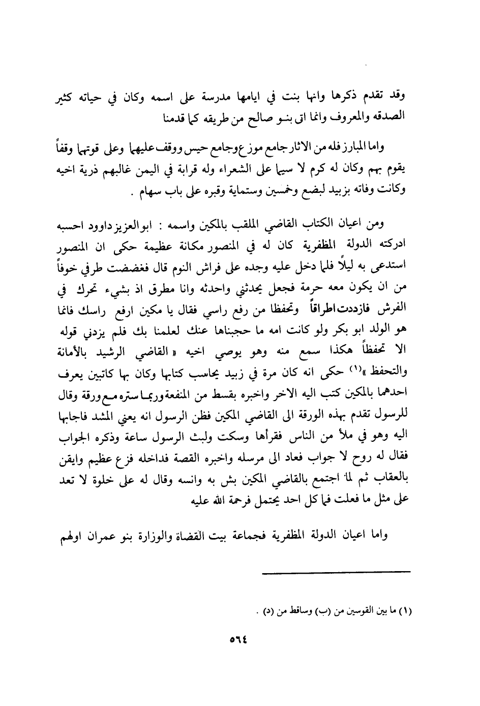 وَمن اعيان الْكتاب القَاضِي الملقب بالمكين واسْمه ابو الْعَزِيز دَاوُود احسبه ادركته الدولة المظفرية كَانَ فِيهِ فِي المنصورمكانة عَظِيمَة حكى ان الْمَنْصُور استدعى بِهِ لَيْلًا فَلَمَّا دخل عَلَيْهِ وجده على فرَاش النّوم قَالَ فغضضت طرفِي خوفًا من ان يكون مَعَه حُرْمَة فَجعل يحدثني واحدثه وَأَنا مطرق اذ بِشَيْء تحرّك فِي الْفرش فازددت اطراقا وتحفظا من رفع رَأْسِي فَقَالَ يَا مكين ارْفَعْ رَأسك فَإِنَّمَا هُوَ الْوَلَد ابو بكر وَلَو كَانَت امهِ مَا حجبناها عَنْك لعلمنا بك فَلم يزدني قَوْله الا تحفظا هَكَذَا سمع مِنْهُ وَهُوَ يُوصي أَخِيه القَاضِي الرشيد بالأمانة والتحفظ حكى انه كَانَ مرّة فِي زبيد يُحَاسب كتابها وَكَانَ بهَا كاتبين يعرف احدهما بالمكين كتب اليه الاخر واخبره بقسط من الْمَنْفَعَة وَرُبمَا ستره مَعَ ورقة وَقَالَ للرسول تقدم بِهَذِهِ الورقة الى القَاضِي المكين فَظن الرَّسُول انه يَعْنِي المشد فاجابها اليه وَهُوَ فِي مَلأ من النَّاس فقرأها وَسكت ولبث الرَّسُول سَاعَة وَذكره الْجَواب فَقَالَ لَهُ روح لَا جَوَاب فَعَاد الى مرسله وَأخْبرهُ الْقِصَّة فداخله فزع عَظِيم وايقن بالعقاب ثمَّ لما اجْتمع بِالْقَاضِي المكين بش بِهِ وانسه وَقَالَ لَهُ على خلْوَة لَا تعد على مثل مَا فعلت فَمَا كل اُحْدُ يحْتَمل فرحمة الله عَلَيْهِ
