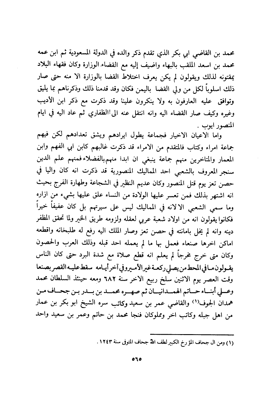 وَأما الاعيان الاخيار فجماعة يطول ايرادهم ويشق تعدادهم لَكِن فيهم جمَاعَة امراء وَكتاب فالمتقدم من الْأُمَرَاء قد ذكرت غالبهم كَابْن ابي الْفَهم وَابْن المعمار والمتاخرين مِنْهُم جمَاعَة يَنْبَغِي ان ابدأ مِنْهُم بالفضلاء فَمنهمْ علم الدّين سنجر الْمَعْرُوف بالشعبي اُحْدُ المماليك المنصورية قد ذكرت انه كَانَ واليا فِي حصن تعز يَوْم قتل الْمَنْصُور وَكَانَ عديم النظير فِي الشجَاعَة وطهارة الْفرج بِحَيْثُ انه اشْتهر بذلك فَمن تعسر عَلَيْهَا الْولادَة من النِّسَاء علق عَلَيْهَا بِشَيْء من ازاره وَمَا سمي الشّعبِيّ الا لِأَنَّهُ فِي المماليك لَيْسَ على سيرتهم بل كَانَ عفيفا خيرا فَكَانُوا يَقُولُونَ انه من اولاد شُعْبَة عَرَبِيّ لعقله ولزومه طَرِيق الْخَيْر وَلما تحقق المظفر دينه وانه لم يخل بامانته فِي حصن تعز وَصَارَ الْملك اليه رفع لَهُ طلبخانه واقطعه أَمَاكِن اخرها صنعاء فَعمل بهَا مَا لم يعمله اُحْدُ قبله وَذَلِكَ الْعَرَب والحصون وَكَانَ مَتى خرج مخرجا لم يعلم انه قطع صَلَاة مَعَ شدَّة الْبرد حَتَّى كَانَ النَّاس يَقُولُونَ مَا فِي المحط من يُصَلِّي رَكْعَة غير الْأَمِير وَفِي آخر أَيَّامه سقط عَلَيْهِ الْقصر بصنعا وَقت الْعَصْر يَوْم الِاثْنَيْنِ سلخ ربيع الاخر سنة 682 وَمَعَهُ حِينَئِذٍ السُّلْطَان مُحَمَّد وَعلي أَبنَاء حَاتِم الهمدانيان ثمَّ صهره مُحَمَّد بن بدر بن جحاف من هَمدَان الْجوف وَالْقَاضِي عمر بن سعيد وَكَاتب سره الشَّيْخ ابوب بكر بن عمار من أهل جبله وَكَاتب اخر ومملوكان فنجا مُحَمَّد بن حَاتِم وَعمر بن سعيد وَاحِد