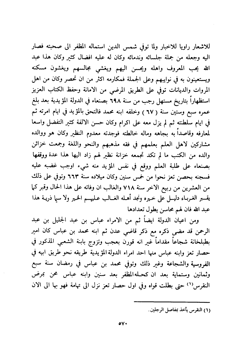 وَمن اعيان الدولة أَيْضا ثمَّ من الامراء عَبَّاس بن عبد الْجَلِيل بن عبد الرَّحْمَن قد مضى ذكره مَعَ ذكر قَاضِي عدن ثمَّ ابْنه مُحَمَّد بن عَبَّاس كَانَ امير بطبلخانة شجاعا مقداما غير انه قورن بعجب وَتزَوج بابنة الشّعبِيّ الْمَذْكُور فِي حِصَار تعز وَابْنه عَبَّاس مِنْهَا اُحْدُ امراء الدولة المؤيدية طَرِيقه نَحْو طَرِيق ابيه فِي الفروسية والشجاعة وَغير ذَلِك وَتُوفِّي مُحَمَّد بن عَبَّاس فِي رَمَضَان سنة سبع وَثَمَانِينَ وستماية بعد أَن كحله المظفر بعد سِنِين وَابْنه عَبَّاس محن بِمَرَض النقرس حَتَّى بطلت قواه وَفِي أول حِصَار تعز نزل الى تهَامَة فَهُوَ بهَا الى الان