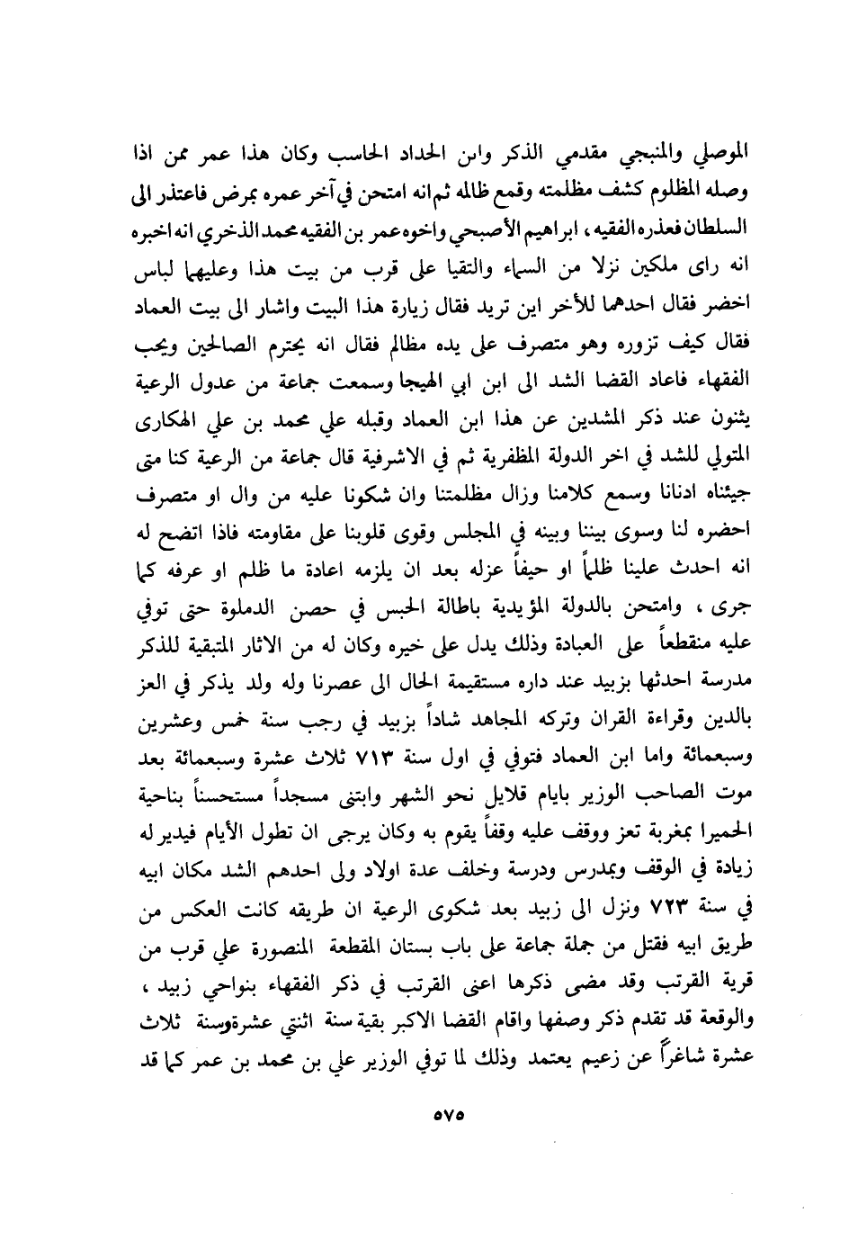 الْموصِلِي والمنبجي مقدمي الذّكر وَابْن الْحداد الحاسب وَكَانَ هَذَا عمر مِمَّن اذا وَصله الْمَظْلُوم كشف مظلمته وقمع ظالمه ثمَّ انه امتحن فِي آخر عمره بِمَرَض فَاعْتَذر الى السُّلْطَان فعذره الْفَقِيه ابراهيم الأصبحي واخوه عمر بن الْفَقِيه مُحَمَّد الذخري انه اخبره انه راي ملكَيْنِ نزلا من السَّمَاء والتقيا على قرب من بَيت هَذَا وَعَلَيْهِمَا لِبَاس اخضر فَقَالَ احدهما للأخر ايْنَ تُرِيدُ فَقَالَ زِيَارَة هَذَا الْبَيْت واشار الى بَيت الْعِمَاد فَقَالَ كَيفَ تزوره وَهُوَ متصرف على يَده مظالم فَقَالَ انه يحترم الصَّالِحين وَيُحب الْفُقَهَاء فاعاد القضا الشد الى ابْن ابي الهيجا وَسمعت جمَاعَة من عدُول الرّعية يثنون عِنْد ذكر المشدين عَن هَذَا ابْن الْعِمَاد وَقَبله عَليّ مُحَمَّد بن عَليّ الهكاري الْمُتَوَلِي للشد فِي أخر الدولة المظفرية ثمَّ فِي الاشرفية قَالَ جمَاعَة من الرّعية كُنَّا مَتى جيئناه ادنانا وَسمع كلَاما وَزَالَ مظلمتنا وان شَكَوْنَا عَلَيْهِ من وَال اَوْ متصرف احضره لنا وَسوى بَيْننَا وَبَينه فِي الْمجْلس وقوى قُلُوبنَا على مقاومته فاذا اتَّضَح لَهُ انه احدثها علينا ظلما اَوْ حيفا عَزله بعد ان يلْزمه اعادة مَا ظلم اَوْ عرفه ككما جرى وامتحن بالدولة المؤيدية باطالة الْحَبْس فِي حصن الدملوة حَتَّى توفّي عَلَيْهِ مُنْقَطِعًا على الْعِبَادَة وَذَلِكَ يدل على خَيره وَكَانَ لَهُ من الاثار المتبقية للذّكر مدرسة اجدثها بزبيد عِنْد دَاره مُسْتَقِيمَة الْحَال الى عصرنا وَله ولد يذكر فِي الْعِزّ بِالدّينِ وَقِرَاءَة الْقرَان وَتَركه الْمُجَاهِد شادا بزبيد فِي رَجَب سنة خمس وَعشْرين وَسَبْعمائة واما ابْن الْعِمَاد فَتوفي فِي أول سنة 713 ثَلَاث عشرَة وَسَبْعمائة بعد موت الصاحب الْوَزير بايام قلايل نَحْو الشَّهْر وابتنى مَسْجِدا مستحسنا بِنَاحِيَة الحميرا بمغربة تعز ووقف عَلَيْهِ وَقفا يقوم بِهِ وَكَانَ يُرْجَى ان تطول الْأَيَّام فيدير لَهُ زِيَادَة فِي الْوَقْف وبمدرس ودرسة وَخلف عدَّة اولاد ولى احدهم الشد مَكَان ابيه فِي سنة 723 وَنزل الى زبيد بعد شكوى الرّعية ان طَرِيقه كَانَت الْعَكْس من طَرِيق ابيه فَقتل من جملَة جمَاعَة على بَاب بُسْتَان الْمُقطعَة المنصورة على قرب من قَرْيَة القرتب وَقد مضى ذكرهَا اعنى القرتب فِي ذكر الْفُقَهَاء بنواحي زبيد والوقعة قد تقدم ذكر وصفهَا واقام القضا الاكبر بَقِيَّة سنة اثْنَتَيْ عشرَة وَسنة ثَلَاث عشرَة شاغرا عَن زعيم يعْتَمد وَذَلِكَ لما توفّي الْوَزير عَليّ بن مُحَمَّد بن عمر كَمَا قد