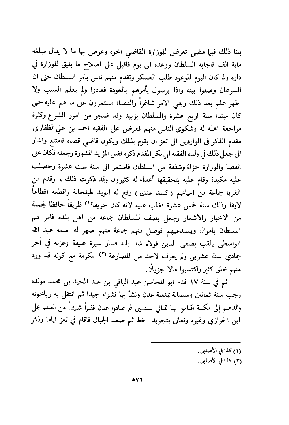 بَينا ذَلِك فِيمَا مضى تعرض للوزارة القَاضِي اخوه وَعرض بهَا مَا لَا يُقَال مبلغه ماية الف فاجابه السُّلْطَان ووعده الى يَوْم فاقبل على اصلاح مَا يَلِيق للوزارة فِي دَاره وَلما كَانَ الْيَوْم الْمَوْعُود طلب الْعَسْكَر وَتقدم مِنْهُم نَاس بِأَمْر السُّلْطَان حَتَّى أَن السرعان وصلوا بَيته واذا برَسُول يَأْمُرهُم بالعودة فعادوا وَلم يعلم السَّبَب وَلَا ظهر علم بعد ذَلِك وَبَقِي الامر شاغرا والقضاة مستمرون على مَا هم عَلَيْهِ حَتَّى كَانَ مبتدا سنة ارْبَعْ عشرَة وَالسُّلْطَان بزبيد وَقد ضجر من امور الشَّرْع وَكَثْرَة مُرَاجعَة اهله لَهُ وشكوى النَّاس مِنْهُم فَعرض على الْفَقِيه احْمَد بن عَليّ الظفاري مقدم الذّكر فِي الواردين الى تعز ان يقوم بذلك وَيكون قَاضِي قُضَاة فَامْتنعَ واشار الى جعل ذَلِك فِي وَلَده الْفَقِيه ابي بكر الْمُقدم ذكره فَقبل الْمُؤَيد المشورة وَجعله فَكَانَ على القضا والوزارة جَزَاء وشفقة من السُّلْطَان فاستمر الى سنة سِتّ عشة وحصلت عَلَيْهِ مكيدة وَقَامَ عَلَيْهِ بتحقيقها حقيقها أَعدَاء لَهُ كَثِيرُونَ وَقد ذكرت ذَلِك وَقدم من الغربا جمَاعَة من اعيانهم كسد عدى رفع لَهُ المويد طبلخانة واقطعه اقطاعا لايقا وَذَلِكَ سنة خمس عشرَة فغلب عَلَيْهِ لانه كَانَ حريفا ظريفا حَافِظًا لجملة من الاخبار والاشعار وَجعل يصف للسُّلْطَان جمَاعَة مناهل بَلَده فامر لَهُم السُّلْطَان باموال ويستدعيهم فوصل مِنْهُم جمَاعَة مِنْهُم صهر لَهُ اسْمه عبد الله الوَاسِطِيّ يلقب بصفي الدّين فولاه شدّ بَابه فَسَار سيرة عنيفة وعزله فِي آخر جمادي سنة عشْرين وَلم يعرف لَاحَدَّ من المصارعة مكرمَة مَعَ كَونه قد ورد مِنْهُم خلق كثير واكتسبوا مَالا جزيلا