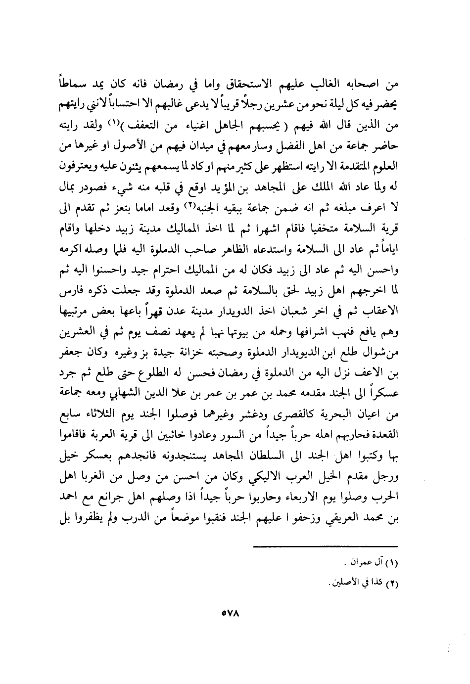 من اصحابه الْغَالِب عَلَيْهِم الِاسْتِحْقَاق واما فِي رَمَضَان فانه كَانَ يمد سماطا يحضر فِيهِ كل لَيْلَة نَحْو من عشْرين رجلا قَرِيبا لَا يدعى غالبهم الا احتسابا لانني رايتهم من الَّذين قَالَ الله فيهم يَحْسبهُم الْجَاهِل اغنياء من التعفف وَلَقَد رايته حَاضر جمَاعَة من أهل الْفضل وَسَار مَعَهم فِي ميدان فيهم من الْأُصُول اَوْ غَيرهَا من الْعُلُوم الْمُتَقَدّمَة الا رايته استظهر على كثير مِنْهُم اَوْ كَاد لما يسمعهم يثنون عَلَيْهِ ويعترفون لَهُ وَلما عَاد الله الْملك على الْمُجَاهِد بن الْمُؤَيد اوقع فِي قلبه مِنْهُ شَيْء فصودر بِمَال لَا اعرف مبلغه ثمَّ انه ضمن جمَاعَة ببقيه الجنبه وَقعد اماما بتعز ثمَّ تقدم الى قَرْيَة السَّلامَة متخفيا فاقام اشهرا ثمَّ لما اخذ المماليك مَدِينَة زبيد دَخلهَا واقام اياما ثمَّ عَاد الى السَّلامَة واستدعاه الطَّاهِر صَاحب الدملوة اليه فَلَمَّا وَصله اكرمه واحسن اليه ثمَّ عَاد الى زبيد فَكَانَ لَهُ من المماليك احترام جيد واحسنوا اليه ثمَّ لما اخرجهم اهل زبيد لحق بالسلامة ثمَّ صعد الدملوة وَقد جعلت ذكره فَارس الاعقاب ثمَّ فِي اخر شعْبَان اخذ الدويدار مَدِينَة عدن قهرا بَاعهَا بعض مرتبيها وهم يافع فنهب اشرافها وَحمله من بيوتها نهبا لم يعْهَد نصف يَوْم ثمَّ فِي الْعشْرين من شَوَّال طلع ابْن الديويدار الدملوة وصحبته خزانَة جَيِّدَة بز وَغَيره وَكَانَ جَعْفَر بن الاعف نزل اليه من الدملوة فِي رَمَضَان فَحسن لَهُ الطُّلُوع حَتَّى طلع ثمَّ جرد عسكرا الى الْجند مقدمه مُحَمَّد بن عمر بن عمر بن علا الدّين الشهابي وَمَعَهُ جمَاعَة من اعيان البحرية كالقصرى ودغشر وَغَيرهمَا فوصلوا الْجند يَوْم الثُّلَاثَاء سَابِع الْقعدَة فحاربهم اهله حَربًا جيدا من السُّور وعادوا خائبين الى قَرْيَة العربة فاقاموا بهَا وَكَتَبُوا أهل الْجند الى السُّلْطَان الْمُجَاهِد يستنجدونه فانجدهم بعسكر خيل وَرجل مقدم الْخَيل الْعَرَب الاليكي وَكَانَ من احسن من وصل من الغربا اهل الْحَرْب وصلوا يَوْم الاربعاء وحاربوا حَربًا جيدا اذا وصلهم اهل جرانع مَعَ احْمَد بن مُحَمَّد العريقي وزحفوا عَلَيْهِم الْجند فَنقبُوا موضعا من الدَّرْب وَلم يظفروا بل