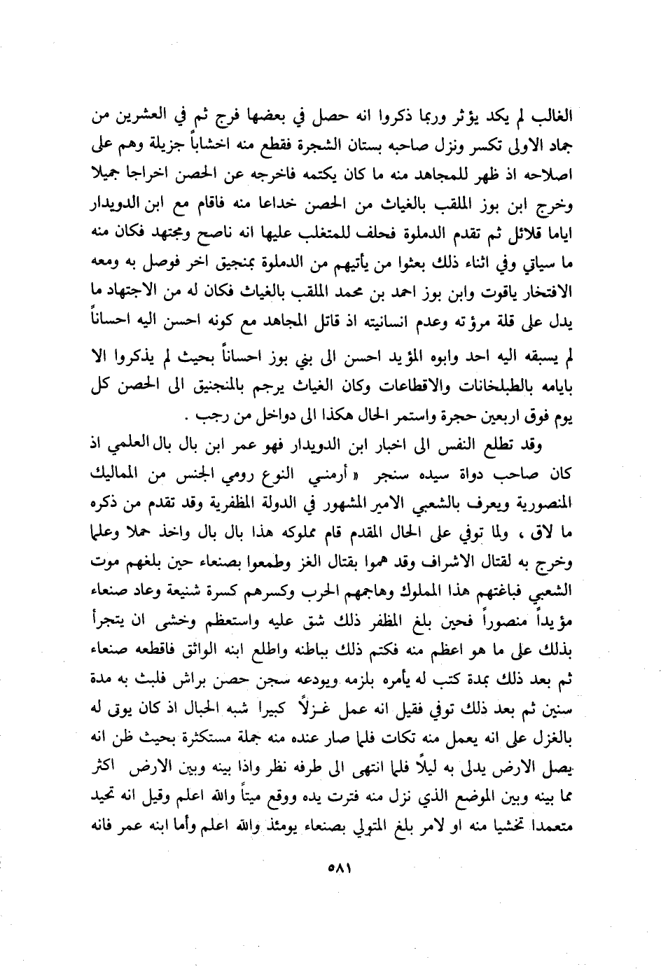 الْغَالِب لم يكد يُؤثر وَرُبمَا ذكرُوا انه حصل فِي بَعْضهَا فرج ثمَّ فِي الْعشْرين من جماد الاولى تكسر وَنزل صَاحبه بُسْتَان الشَّجَرَة فَقطع مِنْهُ اخشابا جزيلة وهم على اصلاحه اذ ظهر للمجاهد مِنْهُ مَا كَانَ يَكْتُمهُ فاخرجه عَن الْحصن اخراجا جميلا وَخرج ابْن بوز الملقب بالغياث من الْحصن خداعا مِنْهُ فاقام مَعَ ابْن الدويدار اياما قَلَائِل ثمَّ تقدم الدملوة فَحلف للمتغلب عَلَيْهَا انه نَاصح ومجتهد فَكَانَ مِنْهُ مَا سَيَأْتِي وَفِي اثناء ذَلِك بعثوا من يَأْتِيهم من الدملوة بمنجيق اخر فوصل بِهِ وَمَعَهُ الافتخار ياقوت وَابْن بوز احْمَد بن مُحَمَّد الملقب بالغياث فَكَانَ لَهُ من الِاجْتِهَاد مَا يدل على قلَّة مرؤته وَعدم انسانيته اذ قَاتل الْمُجَاهِد مَعَ كَونه احسن اليه احسانا لم يسْبقهُ اليه اُحْدُ وابوه الْمُؤَيد احسن الى بني بوز احسانا بِحَيْثُ لم يذكرُوا الا بايامه بالطبلخانات والاقطاعات وَكَانَ الغياث يرْجم بالمنجنيق الى الْحصن كل يَوْم فَوق اربعين حجرَة وَاسْتمرّ الْحَال هَكَذَا الى دواخل من رَجَب