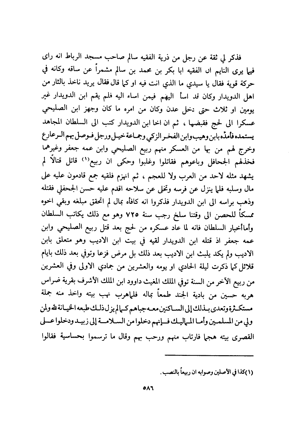 فَذكر لي ثِقَة عَن رجل من ذُرِّيَّة الْفَقِيه سَالم صَاحب مَسْجِد الرِّبَاط انه رأى فِيمَا يرى النايم ان الْفَقِيه ابا بكر بن مُحَمَّد بن سَالم مشمرا عَن سَاقه وكانه فِي حَرَكَة قَوِيَّة فَقَالَ يَا سَيِّدي مَا الَّذِي انت فِيهِ اَوْ كَمَا قَالَ فَقَالَ يُرِيد ناخذ بالثار من اهل الدويدار وَكَانَ قد اسأ اليهم فِيمَن اساء اليه فَلم يقم ابْن الدويدار غير يَوْمَيْنِ اَوْ ثَلَاث حَتَّى دخل عدن وَكَانَ من امْرَهْ مَا كَانَ وجهز ابْن الصليحي عسكرا الى لحج فقبضها ثمَّ ان اخا ابْن الدويدار كتب الى السُّلْطَان الْمُجَاهِد يستمده فأمده بِابْن وهيب وَابْن الْفَخر الزكي وَجَمَاعَة خيل وَرجل فوصل بهم الرعارع وَخرج لَهُم من بهَا من الْعَسْكَر مِنْهُم ربيع الصليحي وَابْن عَمه جَعْفَر وَغَيرهمَا فخذلهم الجحافل وباعوهم فَقَاتلُوا وغلبوا وَحكى ان ربيع قَاتل قتالا لم يشْهد مثله لَاحَدَّ من الْعَرَب وَلَا للعجم ثمَّ انهزم فَلَقِيَهُ جمع قادمون عَلَيْهِ على مَال وسلبه فَلَمَّا ينزل عَن فرسه وتخلى عَن سلاحه اقدم عَلَيْهِ حسن الجحفلي فَقتله وَذهب براسه الى ابْن الدويدار فذكورا انه كافأه بِمَال لم اتحقق مبلغه وَبَقِي اخوه ممسكا للحصن الى وقتنا سلخ رَجَب سنة 725 وهومع ذَلِك يُكَاتب السُّلْطَان وَأما اخبار السُّلْطَان فانه لما عَاد عسكره من لحج بعد قتل ربيع الصليحي وَابْن عَمه جَعْفَر اذ قَتله ابْن الدويدار لقِيه فِي بَيت ابْن الاديب وهومتعلق ابْن الاديب وَلم يكد يلبث ابْن الاديب بعد ذَلِك بل مرض فَزعًا وَتُوفِّي بعد ذَلِك بايام قَلَائِل كَمَا ذكرت لَيْلَة الْحَادِي اَوْ يَوْمه وَالْعِشْرين من جمادي الاولى وَفِي الْعشْرين من ربيع الاخر من السّنة توفّي الْملك المغيث دَاوُود بِابْن الْملك الاشرف بقرية ضراس هربه حُسَيْن من بادية الْجند طَمَعا بِمَالِه فَلَمَّا هرب نهب بَيته واخذ مِنْهُ جملَة مستكثرة وتعدى بذلك الى الساكنين مَعَه جباهم كَمَا لم يزل ذَلِك طبعه الْخِيَانَة لله وَلمن ولي من الْمُسلمين وَأما المماليك فَإِنَّهُم دخلُوا من السَّلامَة إِلَى زبيد ودخلوا على الْقصرى بَيته هجما فارتاب مِنْهُم ورحب بهم وَقَالَ مَا ترسموا بحساسية فَقَالُوا