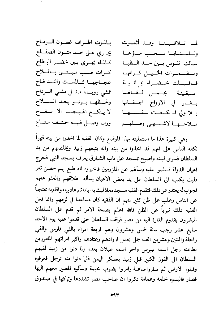 ملاحها لاشته وصلهم ... وَرب وصل فِيهِ حتف متاح ... وَهِي كَبِيرَة هَذَا مَا استمليته بِهَذَا الْموضع وَكَانَ الْفَقِيه لما اخذوا من بَيته قهرا نكفه النَّاس على انهم قد اخذوا من بَيته وانه يتبعهمزبيد ويخلصهم من يَد السُّلْطَان فسرى ليلته واصبح بِمَسْجِد على بَاب الشبارق يعرف بِمَسْجِد النَّبِي فَخرج اعيان الدولة فَسَلمُوا عَلَيْهِ وسألهم عَن الملزومين فاخبروه انه طلع بهم حصن تعز فَلبث يكْتب الى السُّلْطَان على يَد بعض الاعيان يسْأَله اطلاقهم وَالْعَفو عَنْهُم فجوب لَهُ يعْتَذر عَن ذَلِك فَتقدم الْفَقِيه مَسْجِد معَاذ لبث بِهِ اياما ثمَّ عَاد بَيته واقام بِهِ محتجبا عَن النَّاس وَغلب على ظن كثير مِنْهُم ان الْفَقِيه كَانَ مساعدا فِي لَزِمَهُم وَإِنَّمَا فعل الْفَقِيه ذَلِك تبريا عَن الظَّن فَالله أعلم بِصِحَّة الْأَمر ثمَّ قدم على السُّلْطَان المبشرون بقدوم الْغَارة اليه من مصر فَوقف السُّلْطَان حَتَّى قدمُوا عَلَيْهِ يَوْم الاحد سَابِع عشر رَجَب سنة خمس وَعِشْرُونَ وهم اربعة أُمَرَاء بالفي فَارس والفي رَاحِلَة واثنتين وَعشْرين الف جمل يحمل ازوادهموعتادهمواكبر امرائهم المأمورين بِطَاعَتِهِ رجل اسْمه بيبرس واخر اسْمه طيلان بعده وَلما دنوا من زبيد لَقِيَهُمْ السُّلْطَان الى القوز الْكَبِير قبلي زبيد بعسكر الْيمن فَلَمَّا دنوا مِنْهُ ترجل فعرفوه وقبلوا الارض ثمَّ سَارُوا سَاعَة وَأمرُوا بِضَرْب خيمة وسألوه الْمصير مَعَهم اليها فَصَارَ فالبسوه خلعة وعمامة ذكرُوا ان صَاحب مصر تشددها وَتركهَا فِي صندوق