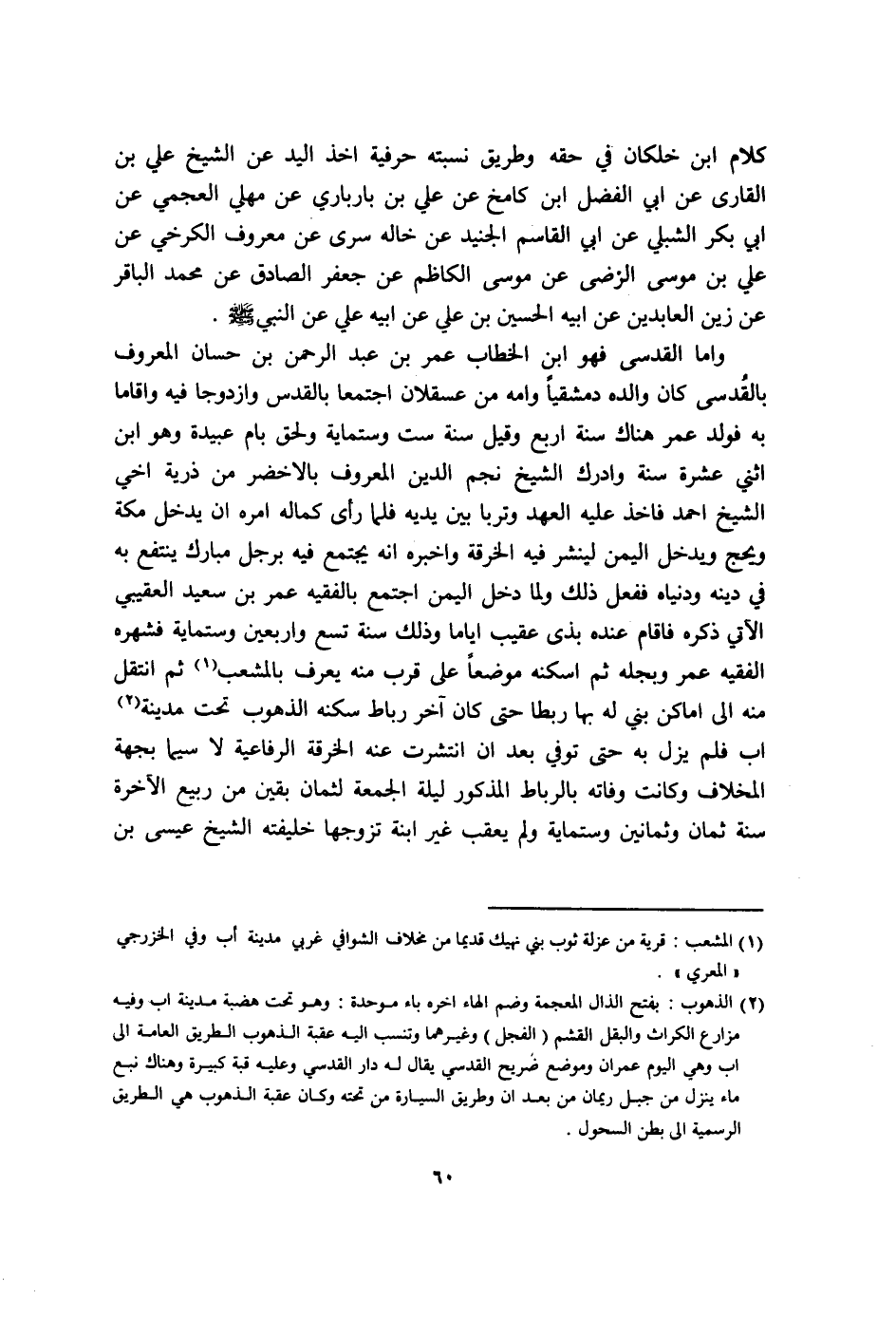 واما الْقُدسِي فَهُوَ ابْن الْخطاب عمر بن عبد الرَّحْمَن بن حسان الْمَعْرُوف بالقدسى كَانَ وَالِده دمشقيا وامه من عسقلان اجْتمعَا بالقدس وازدوجا فِيهِ واقاما بِهِ فولد عمر هُنَاكَ سنة ارْبَعْ وَقيل سنة سِتّ وستماية وَلحق بام عُبَيْدَة وَهُوَ ابْن اثْنَي عشرَة سنة وادرك الشَّيْخ نجم الدّين الْمَعْرُوف بالاخضر من ذُرِّيَّة اخي الشَّيْخ احْمَد فاخذ عَلَيْهِ الْعَهْد وتربا بَين يَدَيْهِ فَلَمَّا رأى كَمَاله امْرَهْ ان يدْخل مَكَّة ويحج وَيدخل الْيمن لينشر فِيهِ الْخِرْقَة واخبره انه يجْتَمع فِيهِ بِرَجُل مبارك ينْتَفع بِهِ فِي دينه ودنياه فَفعل ذَلِك وَلما خل الْيمن اجْتمع بالفقيه عمر بن سعيد العقيبي الْآتِي ذكره فاقام عِنْده بذى عقيب اياما وَذَلِكَ سنة تسع واربعين وستماية فشهره الْفَقِيه عمر وبجله ثمَّ اسكنه موضعا على قرب مِنْهُ يعرف بالمعشب ثمَّ انْتقل مِنْهُ الى اماكن بني لَهُ بهَا ربطا حَتَّى كَانَ آخر رِبَاط سكنه الذهوب تَحت مَدِينَة اب فَلم يزل بِهِ حَتَّى توفّي بعد ان انتشرت عَنهُ الْخِرْقَة الرفاعية لَا سِيمَا بِجِهَة المخلاف وَكَانَت وَفَاته بالرباط الْمَذْكُور لَيْلَة الْجُمُعَة لثمان بَقينَ من ربيع الْآخِرَة سنة ثَمَان وَثَمَانِينَ وستماية وَلم يعقب غير ابْنة تزَوجهَا خَلِيفَته الشَّيْخ عِيسَى بن