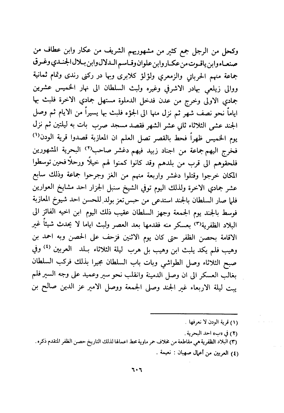 وكحل من الرجل جمع كثير من مشهوريهم الشريف من عكار وَابْن عطاف من صنعاء وَابْن ياقوت من عكار وَابْن علوان وقاسم الدَّلال وَابْن بِلَال الجندي وغرق جمَاعَة مِنْهُم الحرباتي والزمعري ولؤلؤ كلابرى وَبهَا در ركنى رندى وَتَمام ثَمَانِيَة ووالي زَيْلَعِيّ بهادر الاشرفي وَغَيره ولبث السُّلْطَان الى نَهَار الْخَمِيس عشْرين جمادي الاولى وَخرج من عدن فَدخل الدملوة مستهل جمادي الاخرة فَلبث بهَا اياما نَحْو نصف شهر ثمَّ نزل مِنْهَا الى الجؤه فَلبث بهَا يَسِيرا من الايام ثمَّ وصل الْجند عشى الثُّلَاثَاء ثَانِي عشر الشَّهْر فقصد مَسْجِد صرب بَات بِهِ لَيْلَتَيْنِ ثمَّ نزل يَوْم الْخَمِيس ظهرا فحط بِالْقصرِ تصل الْعلم ان المعازبة قصدُوا قَرْيَة الودن فَخرج اليهم جمَاعَة من اجناد زبيد فيهم دغشر صَاحب البحرية الْمَشْهُورين فلحقوهم الى قرب من بلدهم وَقد كَانُوا كمنوا لَهُم خيلا ورحلا فحين توسطوا الْمَكَان خَرجُوا وَقتلُوا دغشر واربعة مِنْهُم من الغز وجرحوا جمَاعَة وَذَلِكَ سَابِع عشر جمادي الاخرة وَلذَلِك الْيَوْم توفّي الشَّيْخ سنبل الجزار اُحْدُ مَشَايِخ العوارين فَلَمَّا صَار السُّلْطَان بالجند استدعى من حبس تعز بِولد لِلْحسنِ اُحْدُ شُيُوخ المعازبة فوسط بالجند يَوْم الْجُمُعَة وجهز السُّلْطَان بعد الْعَصْر ولبث اياما لَا يحدث شَيْئا غير الْبِلَاد الظفرية بعسكر مِنْهُ فَقَدمهَا بعد الْعَصْر ولبث اياما لَا يحدث شَيْئا غير الاقامة بحصن الظفر حَتَّى كَانَ يَوْم الِاثْنَيْنِ فزحف على الْحصن وَبِه أَحْمد بن وهيب فَلم يكد يلبث ابْن وهيب بل هرب لَيْلَة الثُّلَاثَاء بلد العربين وَفِي صبح الثُّلَاثَاء وصل الطواشي وَبَات بَاب السُّلْطَان مجيرا بذلك فَركب السُّلْطَان بغالب الْعَسْكَر الى أَن وصل الدمينة وانقلب نَحْو سير وعميد على وَجه السّير فَلم يبت لَيْلَة الاربعاء غير الْجند وَصلى الْجُمُعَة وَوصل الامير عز الدّين صَالح بن