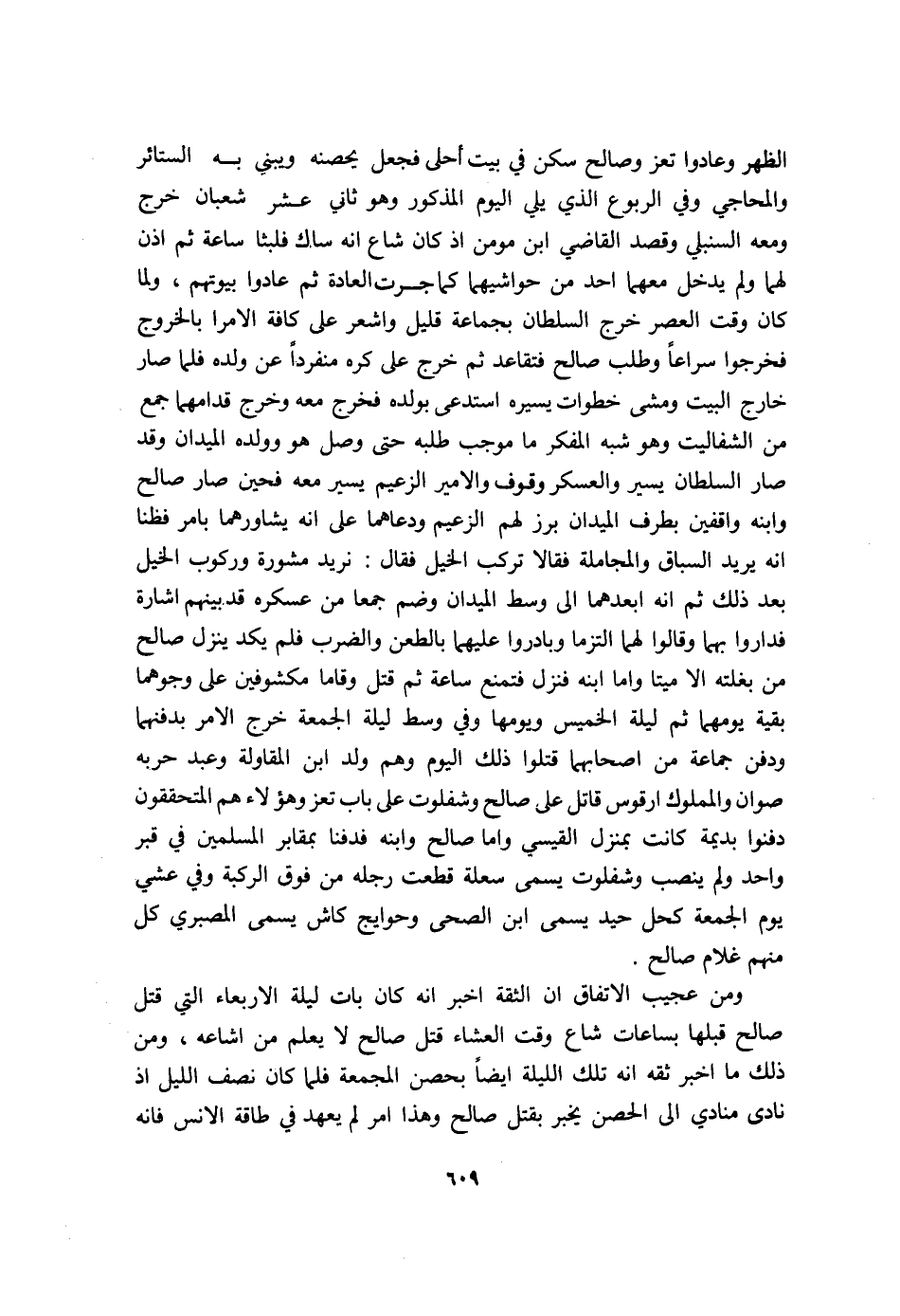 الظّهْر وعادوا تعز وَصَالح سكن فِي بَيت أحلى فَجعل يحصنه وَيَبْنِي بِهِ الستائر والمحاجي وَفِي الربوع الَّذِي يَلِي الْيَوْم الْمَذْكُور وَهُوَ ثَانِي عشر شعْبَان خرج وَمَعَهُ السنبلي وَقصد القَاضِي ابْن مومن اذ كَانَ شاع انه ساك فلبثا سَاعَة ثمَّ اذن لَهما وَلم يدْخل مَعَهُمَا اُحْدُ من حواشيهما كَمَا جرت الْعَادة ثمَّ عَادوا بُيُوتهم وَلما كَانَ وَقت الْعَصْر خرج السُّلْطَان بِجَمَاعَة قَلِيل واشعر على كَافَّة الامرا بِالْخرُوجِ فَخَرجُوا سرَاعًا وَطلب صَالح فتقاعد ثمَّ خرج على كره مُنْفَردا عَن وَلَده فَلَمَّا صَار خَارج الْبَيْت وَمَشى خطوَات يسيره استدعى بولده فَخرج مَعَه وَخرج قدامهما جمع من الشفاليت وَهُوَ شبه المفكر مَا مُوجب طلبه حَتَّى وصل هُوَ وَولده الميدان وَقد صَار السُّلْطَان يسير والعسكر وقُوف والامير الزعيم يسير مَعَه فحين صَار صَالح وَابْنه واقفين بِطرف الميدان برز لَهُم الزعيم ودعاهما على انه يشاورهما بامر فظنا انه يُرِيد السباق والمجاملة فَقَالَا تركب الْخَيل فَقَالَ نُرِيد مشورة وركوب الْخَيل بعد ذَلِك ثمَّ انه ابعدهما الى وسط الميدان وَضم جمعا من عسكره قد بَينهم اشارة فَدَارُوا بهما وَقَالُوا لَهما التزما وَبَادرُوا عَلَيْهِمَا بالطعن وَالضَّرْب فَلم يكد ينزل صَالح من بغلته الا مَيتا واما ابْنه فَنزل فتمنع سَاعَة ثمَّ قتل وقاما مكشوفين على وجوهما بَقِيَّة يومهما ثمَّ لَيْلَة الْخَمِيس ويومها وَفِي وسط لَيْلَة الْجُمُعَة خرج الامر بدفنهما وَدفن جمَاعَة من اصحابهما قتلوا ذَلِك الْيَوْم وهم ولد ابْن المقاولة وَعبد حَرْبَة صوان والمملوك ارقوس قَاتل على صَالح وشفلوت على بَاب تعز وَهَؤُلَاء هم المتحققون دفنُوا بديمة كَانَت بمنزل الْقَيْسِي واما صَالح وَابْنه فدفنا بمقابر الْمُسلمين فِي قبر وَاحِد وَلم ينصب وشفلوت يُسمى سعلة قطعت رجله من فَوق الرّكْبَة وَفِي عشى يَوْم الْجُمُعَة كحل حيد يُسمى ابْن الصحى وحوايج كاش يُسمى المصبري كل مِنْهُم غُلَام صَالح