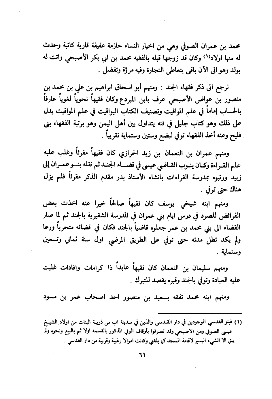 وَمِنْهُم سُلَيْمَان بن النُّعْمَان كَانَ فَقِيها عابدا ذَا كرامات وافادات غلبت عَلَيْهِ الْعِبَادَة وَتُوفِّي بالجند وقبره يقْصد للتبرك