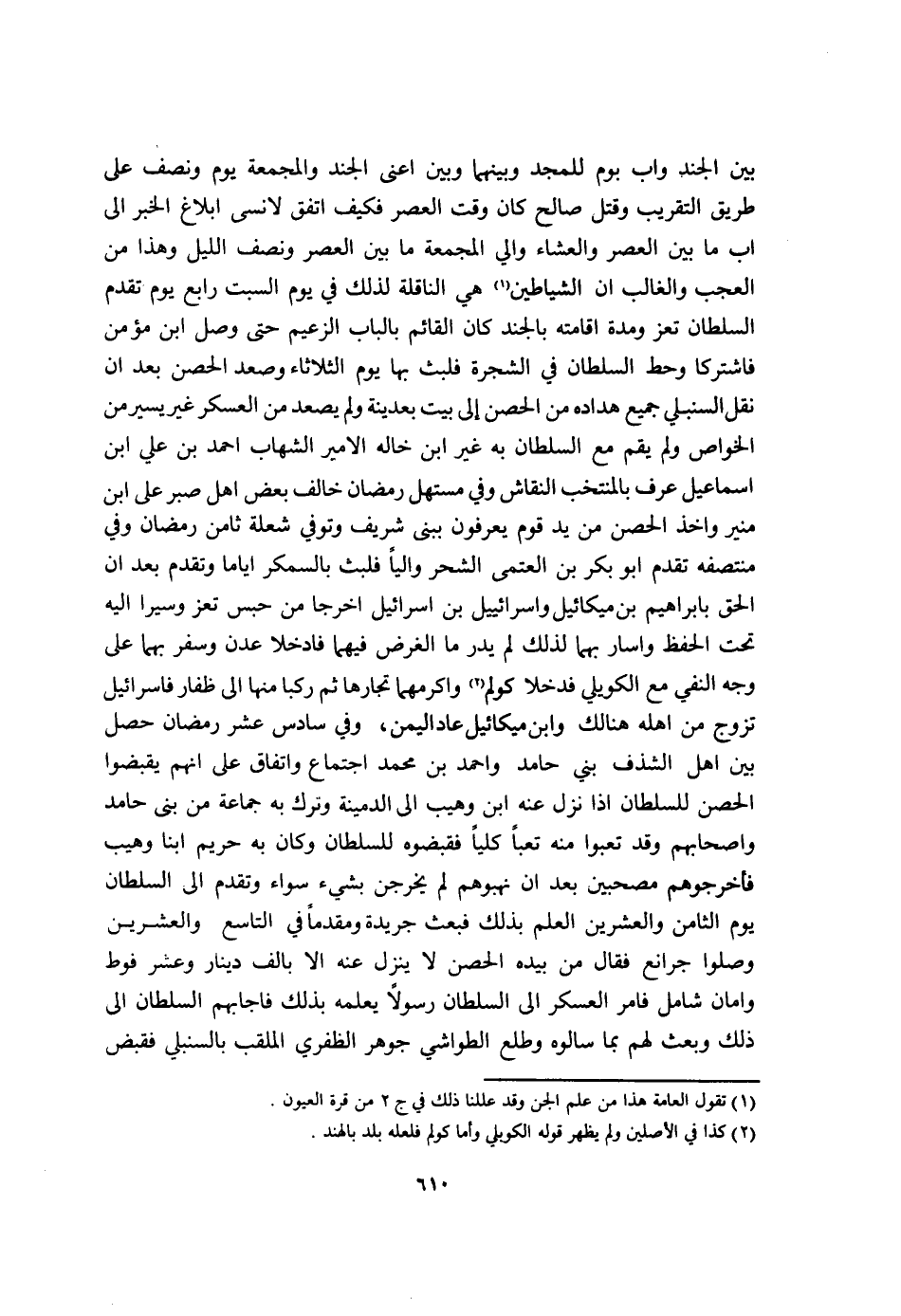 بَين الْجند واب بوم للمجد وَبَينهمَا وَبَين اعنى الْجند والمجمعة يَوْم وَنصف على طَرِيق التَّقْرِيب وَقتل صَالح كَانَ وَقت الْعَصْر فَكيف اتّفق لانسى ابلاغ الْخَبَر الى أَب مَا بَين الْعَصْر وَالْعشَاء وَالِي المجمعة مَا بَين الْعَصْر وَنصف اللَّيْل وَهَذَا من الْعجب وَالْغَالِب ان الشَّيَاطِين هِيَ الناقلة لذَلِك فِي يَوْم السبت رَابِع يَوْم تقدم السُّلْطَان تعز وَمُدَّة اقامته بالجند كَانَ الْقَائِم بِالْبَابِ الزعيم حَتَّى وصل ابْن مُؤمن فاشتركا وَحط السُّلْطَان فِي الشَّجَرَة فَلبث بهَا يَوْم الثُّلَاثَاء وَصعد الْحصن بعد ان نقل السنبلي جَمِيع هداده من الْحصن الى بَيت بعدينة وَلم يصعد من الْعَسْكَر غير يسير من الْخَواص وَلم يقم مَعَ السُّلْطَان بِهِ غير ابْن خَاله الامير الشهَاب أَحْمد بن عَليّ ابْن اسماعيل عرف بالمنتخب النقاش وَفِي مستهل رَمَضَان خَالف بعض أهل صَبر على ابْن مُنِير وَأخذ الْحصن من يَد قوم يعْرفُونَ ببني شرِيف وَتُوفِّي شعلة ثامن رَمَضَان وَفِي منتصفه تقدم ابو بكر بن العتمى الشحر واليا فَلبث بالسمكر اياما وَتقدم بعد أَن الْحق بابراهيم بن مِيكَائِيل واسرائييل بن اسرائيل اخرجا من حبس تعز وسيرا اليه تَحت الْحِفْظ وأسار بهما لذَلِك لم يدر مَا الْغَرَض فيهمَا فادخلا عدن وسفر بهما على وَجه النَّفْي مَعَ الكويلي فدخلا كولم واكرمهما تجارها ثمَّ ركبا مِنْهَا الى ظفار فاسرائيل تزوج من أَهله هُنَالك وَابْن مِيكَائِيل عَاد الْيمن وَفِي سادس عشر رَمَضَان حصل بَين أهل الشذف بني حَامِد وَأحمد بن مُحَمَّد اجْتِمَاع واتفاق على انهم يقبضوا الْحصن للسُّلْطَان اذا نزل عَنهُ ابْن وهيب الى الدمينة وَترك بِهِ جمَاعَة من بني حَامِد واصحابهم وَقد تعبوا مِنْهُ تعبا كليا فقبضوه للسُّلْطَان وَكَانَ بِهِ حَرِيم ابْنا وهيب فأخرجوهم مصحبين بعد أَن نهبوهم لم يخْرجن بِشَيْء سَوَاء وَتقدم الى السُّلْطَان يَوْم الثَّامِن وَالْعِشْرين الْعلم بذلك فَبعث جَرِيدَة ومقدما فِي التَّاسِع وَالْعِشْرين وصلوا جرانع فَقَالَ من بِيَدِهِ الْحصن لَا ينزل عَنهُ الا بِأَلف دِينَار وَعشر فوط وأمان شَامِل فَأمر الْعَسْكَر الى السُّلْطَان رَسُولا يُعلمهُ بذلك فاجابهم السُّلْطَان الى ذَلِك وَبعث لَهُم بِمَا سَأَلُوهُ وطلع الطواشي جَوْهَر الظفري الملقب بالسنبلي فَقبض