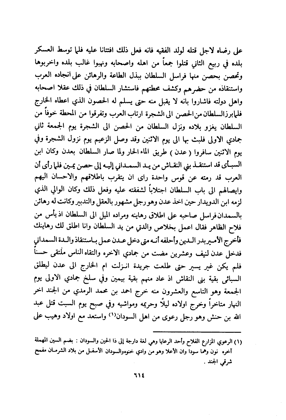على رِضَاهُ لاجل قَتله لولد الْفَقِيه فانه فعل ذَلِك افتتانا عَلَيْهِ فَلَمَّا توَسط الْعَسْكَر بَلَده فِي ربيع الثَّانِي قتلوا جمعا من أَهله واصحابه ونهبوا غَالب بَلَده واخربوها وتحصن بحصن مِنْهَا فراسل السُّلْطَان ببذل الطَّاعَة والرهائن على انجاده الْعَرَب واستنقاذه من حضرهم وكشف محطتهم فَاسْتَشَارَ السُّلْطَان فِي ذَلِك عقلا اصحابه وَأهل دولته فاشاروا بانه لَا يقبل مِنْهُ حَتَّى يسلم لَهُ الْحُصُون الَّذِي اعطاه الْخَارِج فَلَمَّا برز السُّلْطَان من الْحصن الى الشَّجَرَة ارتاب الْعَرَب وَتَفَرَّقُوا من المحطة خوفًا من السُّلْطَان يَغْزُو بِلَاده وَنزل السُّلْطَان من الْحصن الى الشَّجَرَة يَوْم الْجُمُعَة ثَانِي جمادي الاولى فَلبث بهَا الى يَوْم الِاثْنَيْنِ وَقد وصل الزعيم يَوْم نزُول الشَّجَرَة وَفِي يَوْم الِاثْنَيْنِ سافروا عدن طريقالماء الْحَار وَلما صَار السُّلْطَان بعدن وَكَانَ ابْن السبأي قد استنقذ بني النقاش من يَد السمداني اليه الى حصن يَمِين فَلَمَّا رأى أَن الْعَرَب قد رمته عَن قَوس وَاحِدَة رَأْي ان يتَقرَّب باطلاقهم والاحسان اليهم وايصالهم الى بَاب السُّلْطَان اجتلابا لشفقته عَلَيْهِ وَفعل ذَلِك وَكَانَ الْوَالِي الَّذِي لزمَه ابْن الدويدار حِين اخذ عدن وَهُوَ رجل مَشْهُور بِالْعقلِ وَالتَّدْبِير وَكَانَت لَهُ رهائن بالسمدان فراسل صَاحبه على اطلاق رهاينه وَمرَاده الْميل الى السُّلْطَان اذ يأس من فلاح الظَّاهِر فَقَالَ أعمل بخلاص والدتي من يَد السُّلْطَان وَأَنا اطلق لَك رهاينك فَأخْرج الْأَمِير بدر الدّين وأحلفه انه مَتى دخل عدن عمل باستنقاذ وَالِدَة السمداني فَدخل عدن لنيف وَعشْرين مَضَت من جمادي الاخرة والتقاه النَّاس ملتقى حسنا فَلم يكن غير يسير حَتَّى طلعت جَرِيدَة انزلت أم الْخَارِج الى عدن ليطلق السبائي بَقِيَّة بني النقاش اذ عَاد مِنْهُم بَقِيَّة بِيَمِين وَفِي سلخ جمادي الاولى يَوْم الْجُمُعَة وَهُوَ التَّاسِع وَالْعشْرُونَ مِنْهُ خرج احْمَد بن مُحَمَّد الرمدي من الْجند اخر النَّهَار متاخرا وَخرج اولاده لَيْلًا وحريمه ومواشيه وَفِي صبح يَوْم السبت قتل عبد الله بن حَنش وَهُوَ رجل رعوى من اهل السودَان واستعد مَعَ اولاد وهيب على