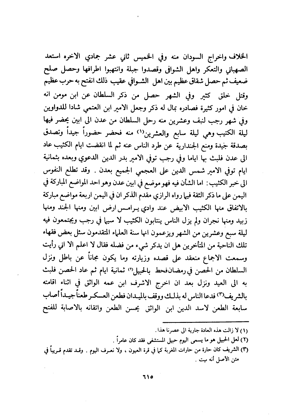 وَقد تطلع النُّفُوس الى خبر الْكَثِيب اما الشَّأْن فِيهِ فَهُوَ مَوضِع فِي ابين عدن وَهُوَ أحد الْمَوَاضِع الْمُبَارَكَة فِي الْيمن على مَا ذكر الثِّقَة فِيمَا رَوَاهُ الرَّازِيّ مقدم الذّكر ان فِي الْيمن اربعة مَوَاضِع مباركة بالِاتِّفَاقِ مِنْهَا الْكَثِيب الابيض عِنْد وَادي يرامس ارْض ابين وَمِنْهَا الْجند وَمِنْهَا زبيد وَمِنْهَا نَجْرَان وَلم يزل النَّاس ينتابون الْكَثِيب لَا سِيمَا فِي رَجَب ويجتمعون فِيهِ لَيْلَة سبع وَعشْرين من الشَّهْر ويزعمون انها سنة الْعلمَاء المتقدمون سُئِلَ بعض فُقَهَاء تِلْكَ النَّاحِيَة من الْمُتَأَخِّرين هَل ان يذكر شَيْء من فَضله فَقَالَ لَا اعْلَم الا اني رايت وَسمعت الاجماع مُنْعَقد على قَصده وزيارته وَمَا يكون مجَّانا عَن بَاطِل وَنزل السُّلْطَان من الْحصن فِي رَمَضَان فحط بالحبيل ثَمَانِيَة ايام ثمَّ عَاد الْحصن فَلبث بِهِ الى الْعِيد وَنزل بعد ان اخْرُج الاشرف ابْن عَمه الواثق فِي اثناء اقامته بالشريف فَدَعَا النَّاس لَهُ بذلك ووقف بالميدان فطعن الْعَسْكَر طَعنا جيدا أصَاب سابعة الطعْن لاسد الدّين ابْن الواثق يحسن الطعْن واتقانه بالاصابة لِلْفَتْحِ