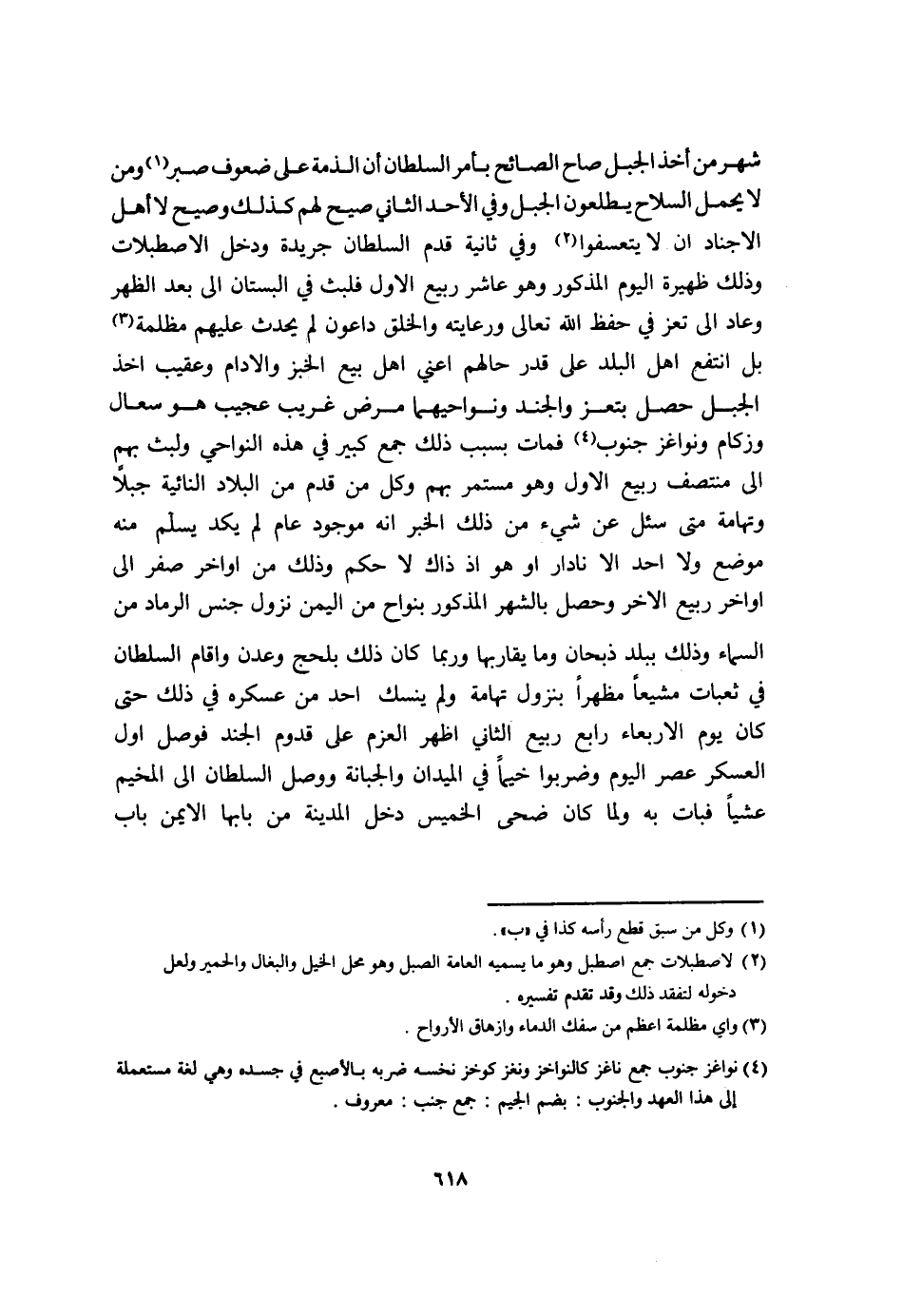 شهر من أَخذ الْجَبَل صَاح الصائح بِأَمْر السُّلْطَان أَن الذِّمَّة على ضعوف صَبر وَمن لَا يحمل السِّلَاح يطلعون الْجَبَل وَفِي الْأَحَد الثَّانِي صِيحَ لَهُم كَذَلِك وصيح لَا أهل الاجناد ان لَا يتعسفوا وَفِي ثَانِيَة قدم السُّلْطَان جَرِيدَة وَدخل الاصطبلات وَذَلِكَ ظهيرة الْيَوْم الْمَذْكُور هُوَ عَاشر ربيع الاول فَلبث فِي الْبُسْتَان الى بعد الظّهْر وَعَاد الى تعز فيحفظ الله تَعَالَى ورعايته والخلق داعون لم يحدث عَلَيْهِم مظْلمَة بل انْتفع اهل الْبَلَد على قدر حَالهم اعني اهل بيع الْخبز والادام وعقيب اخذ الْجَبَل حصل بتعز والجند ونواحيهما مرض غَرِيب عَجِيب هُوَ سعال وزكام ونواغز جنوب فَمَاتَ بِسَبَب ذَلِك جمع كَبِير فِي هَذِه النواحي ولبث بهم الى منتصف ربيع الاول وَهُوَ مُسْتَمر بهم وكل من قدم من الْبِلَاد النائية جبلا وتهامة مَتى سُئِلَ عَن شَيْء من ذَلِك الْخَبَر انه مَوْجُود عَام لم يكد يسلم مِنْهُ مَوضِع وَلَا اُحْدُ الا نادار اَوْ هُوَ اذ ذَاك لَا حكم وَذَلِكَ من اواخر صفر الى اواخر ربيع الاخر وَحصل بالشهر الْمَذْكُور بنواح من الْيمن نزُول جنس الرماد من السَّمَاء وَذَلِكَ بِبَلَد ذبحان وَمَا يقاربها وَرُبمَا كَانَ ذَلِك بلحج وعدن واقام السُّلْطَان فِي ثعبات مشيعا مظْهرا بنزول تهَامَة وَلم ينْسك اُحْدُ من عسكره فِي ذَلِك حَتَّى كَانَ يَوْم الاربعاء رَابِع ربيع الثَّانِي اظهرالعزم على قدوم الْجند فوصل اول الْعَسْكَر عصر الْيَوْم وضربوا خيما فِي الميدان والجبانة وَوصل السُّلْطَان الى المخيم عشيا فَبَاتَ بِهِ وَلما كَانَ ضحى الْخَمِيس دخل الْمَدِينَة من بَابهَا الايمن بَاب