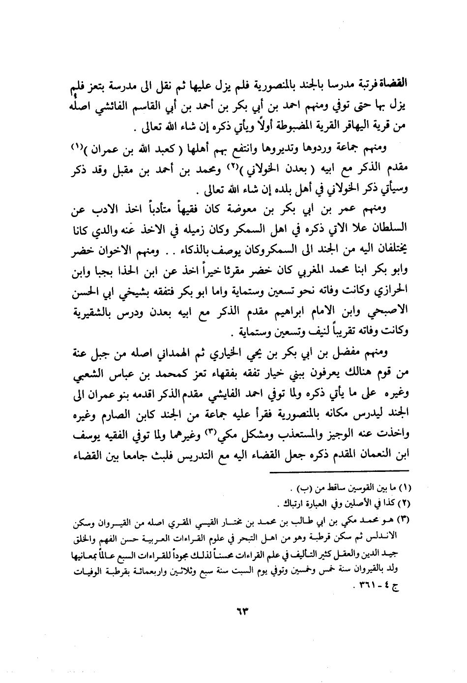 وَمِنْهُم الاخوان خضر وابو بكر ابْنا مُحَمَّد المغربي كَانَ خضر مقرئا خيرا اخذ عَن ابْن الحذا بجبا وَابْن الْحرَازِي وَكَانَت وَفَاته نَحْو تسعين وستماية واما ابو بكر فتفقه بشيخي ابي الْحسن الاصبحي وَابْن الامام ابراهيم مقدم الذّكر مَعَ ابيه بعدن ودرس بالشقيرية وَكَانَت وَفَاته تَقْرِيبًا لنيف وَتِسْعين وستماية وَمِنْهُم مفضل بن ابي بكر بن يحي الخياري ثمَّ الْهَمدَانِي اصله من جبل عنة من قوم هُنَالك يعْرفُونَ ببني خِيَار تفقه بفقهاء تعز كمحمد بن عَبَّاس الشّعبِيّ وَغَيره على مَا يَأْتِي ذكره وَلما توفّي احْمَد الفايشي مقدم الذّكر اقدمه بَنو عمرَان الى الْجند ليدرس مَكَانَهُ بالمنصورية فَقَرَأَ عَلَيْهِ جمَاعَة من الْجند كَابْن الصارم وَغَيره واخذت عَنهُ الوجير والمستعذب ومشكل مكي وَغَيرهمَا وَلما توفّي الْفَقِيه يُوسُف ابْن النُّعْمَان الْمُقدم ذكره جعل الْقَضَاء اليه مَعَ التدريس فَلبث جَامعا بَين الْقَضَاء