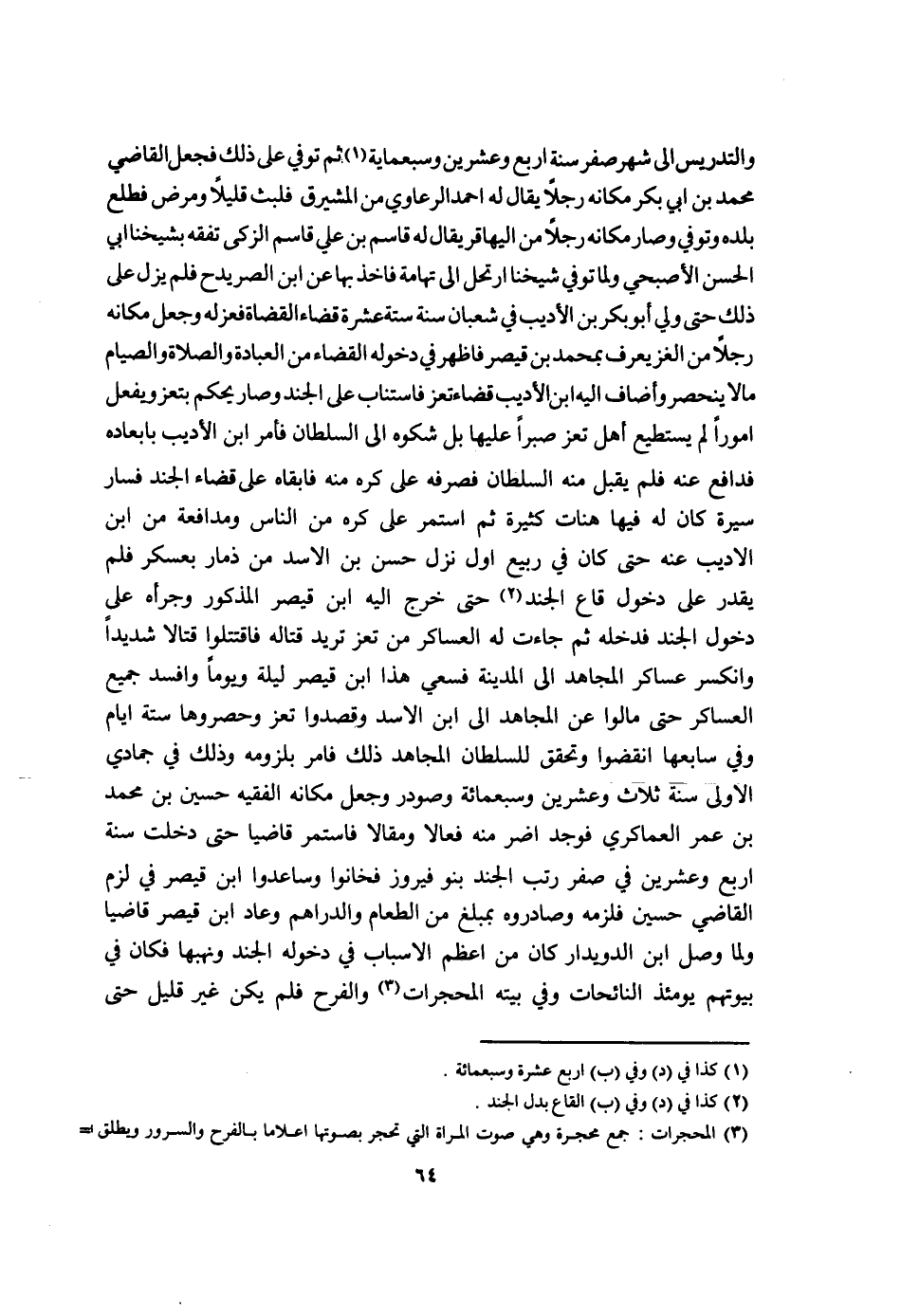 والتدريس الى شهر صفر سنة ارْبَعْ وَعشْرين وسبعماية ثمَّ توفّي على ذَلِك فَجعل القَاضِي مُحَمَّد بن ابي بكر مَكَانَهُ رجلا يُقَال لَهُ احْمَد الرعاوي من المشيرق فَلبث قَلِيلا وَمرض فطلع بَلَده وَتُوفِّي وَصَارَ مَكَانَهُ رجلا من اليهاقر يُقَال لَهُ قَاسم بن عَليّ قَاسم الزكى تفقه بشيخنا أبي الْحسن الأصبحي وَلما توفّي شَيخنَا ارتحل الى تهَامَة فاخذ بهَا عَن ابْن الصريدح فَلم يزل على ذَلِك حَتَّى ولي أَبُو بكر بن الأديب فِي شعْبَان سنة سِتَّة عشرَة قَضَاء الْقُضَاة فَعَزله وَجعل مَكَانَهُ رجلا من الغز يعرف بِمُحَمد بن قَيْصر فاظهر فِي دُخُوله الْقَضَاء من الْعِبَادَة وَالصَّلَاة وَالصِّيَام مَالا ينْحَصر واضاف اليه ابْن الأديب قَضَاء تعز فاستناب على الْجند وَصَارَ يحكم بتعز وَيفْعل امورا لم يَسْتَطِيع أهل تعز صبرا عَلَيْهَا بل شكوه الى السُّلْطَان فَأمر ابْن الأديب بابعاده فدافع عَنهُ فَلم يقبل مِنْهُ السُّلْطَان فَصَرفهُ على كره مِنْهُ فابقاه على قَضَاء الْجند فَسَار سيرة كَانَ لَهُ فِيهَا هَنَات كَثِيرَة ثمَّ اسْتمرّ على كره من النَّاس ومدافعة من ابْن الاديب عَنهُ حَتَّى كَانَ فِي ربيع اول نزل حسن بن الاسد من ذمار بعسكر فَلم يقدر على دُخُول قاع الْجند حَتَّى خرج اليه ابْن قَيْصر الْمَذْكُور وجرأه على دُخُول الْجند فدخله ثمَّ جَاءَت لَهُ العساكر من تعز تُرِيدُ قِتَاله فَاقْتَتلُوا قتالا شَدِيدا وانكسر عَسَاكِر الْمُجَاهِد الى الْمَدِينَة فسعي هَذَا ابْن قَيْصر لَيْلَة وَيَوْما وافسد جَمِيع العساكر حَتَّى مالوا عَن الْمُجَاهِد الى ابْن الاسد وقصدوا تعز وحصروها سِتَّة أَيَّام وَفِي سابعها اقنضوا وَتحقّق للسُّلْطَان الْمُجَاهِد ذَلِك فامر بلزومه وَذَلِكَ فِي جمادي الاولى سنة ثَلَاث وَعشْرين وَسَبْعمائة وصودر وَجعل مَكَانَهُ الْفَقِيه حُسَيْن بن مُحَمَّد بن عمر العماكري فَوجدَ اضر مِنْهُ فعالا ومقالا فاستمر قَاضِيا حَتَّى دخلت سنة ارْبَعْ وَعشْرين فِي صفر رتب الْجند بَنو فَيْرُوز فخانوا وساعدوا ابْن قَيْصر فِي لزم القَاضِي حُسَيْن فَلَزِمَهُ وصادروه بمبلغ من الطَّعَام وَالدَّرَاهِم وَعَاد ابْن قَيْصر قَاضِيا وَلما وصل ابْن الدويدار كَانَ من اعظم الاسباب فِي دُخُوله الْجند ونهبها فَكَانَ فِي بُيُوتهم يَوْمئِذٍ النائحات وَفِي بَيته المحجرات والفرح فَلم يكن غير قَلِيل حَتَّى