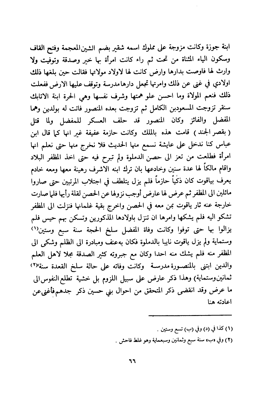 ابْنة جوزة وَكَانَت مُزَوّجَة على مَمْلُوك اسْمه شقير بِضَم الشين الْمُعْجَمَة وَفتح الْقَاف وَسُكُون الْيَاء الْمُثَنَّاة من تَحت ثمَّ رَاء كَانَت امْرَأَة بهَا خير وَصدقَة وَتوفيت وَلَا وَارِث لَهَا فاوصت بدارها وَارْضَ كَانَت لَهَا لاولاد مولاتها فَقَالَت حِين بلغَهَا ذَلِك اولادي فِي غنى عَن ذَلِك وامرتها تجْعَل دارها مدرسة وَتوقف عَلَيْهَا الارض فَفعلت ذَلِك فَنعم المولاة وَمَا احسن علو همتها وَشرف نَفسهَا وَهِي الْحرَّة ابْنة الاتابك سنقر تزوجت المسعودين الْكَامِل ثمَّ تزوجت بعده الْمَنْصُور فَاتَت لَهُ بولدين وهما الْمفضل والفائز وَكَانَ الْمَنْصُور قد حلف الْعَسْكَر للمفضل وَلما قتل بقصر الْجند قَامَت هَذِه بِالْملكِ وَكَانَت حازمة عفيفة غير انها كَمَا قَالَ ابْن عَبَّاس كُنَّا ندخل على عايشة نسْمع مِنْهَا الحَدِيث فَلَا نخرج مِنْهَا حَتَّى نعلم انها امْرَأَة فطلعت من تعز الى حصن الدملوة وَلم تَبْرَح فِيهِ حَتَّى أَخذ المظفر الْبِلَاد واقام مَالِكًا لَهَا عدَّة سِنِين وخادعها بَان ترك ابْنه الاشرف رهينة مَعهَا وَمَعَهُ خَادِم يعرف بياقوت كَانَ ذكيا حازما فَلم يزل يتلطف فِي اجتلاب المرتبين حَتَّى صَارُوا مائلين الى المظفر ثمَّ عرض لَهَا عَارض أوجب نُزُولهَا عَن الْحصن لقلَّة رأيها فَلَمَّا صَارَت خَارِجَة عَنهُ ثار ياقوت بِمن مَعَه فِي الْحصن واخرج بَقِيَّة غلمانها فَنزلت الى المظفر تَشْكُو اليه فَلم يشكها وامرها ان تنزل باولادها الْمَذْكُورين وتسكن بهم حيس فَلم يزَالُوا بهَا حَتَّى توفوا وَكَانَت وَفَاة الْمفضل سلخ الْحجَّة سنة سبع وَسِتِّينَ وستماية وَلم يزل ياقوت نايبا بالدملوة فَكَانَ بِهِ عنف ومبادرة الى الظُّلم وشكى الى المظفر مِنْهُ فَلم يشك مِنْهُ احدا وَكَانَ مَعَ جبروته كثير الصَّدَقَة مجلا لاهل الْعلم وَالدّين ابتنى بالمنصورة مدرسة وَكَانَت وَفَاته على حَالَة سلخ الْقعدَة سنة ثَمَانِينَ وستماية وَهَذَا ذكر عَارض على سَبِيل اللُّزُوم بل خشيَة تطلع النُّفُوس الى مَا عرض وَقد انْقَضى ذكر المتحقق من احوال بني حُسَيْن ذكر جدهم فأغنى عَن اعادته هُنَا
