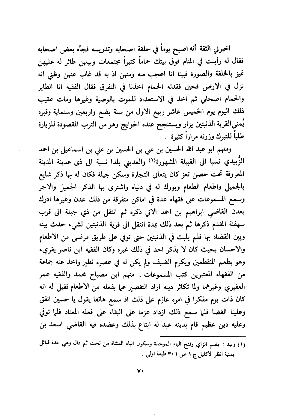 وَمِنْهُم ابو عبد الله الْحُسَيْن بن عَليّ بن الْحُسَيْن بن عَليّ بن اسماعيل بن احْمَد الزبيدِيّ نسبا الى الْقَبِيلَة الْمَشْهُورَة ولاعديني بَلَدا نِسْبَة الى ذى عدينة الْمَدِينَة الْمَعْرُوفَة تَحت حصن تعز كَانَ يتعانى التِّجَارَة وَسكن جيلة فَكَانَ لَهُ بهَا ذكر شايع بالجميل واطعام الطَّعَام وبورك لَهُ فِي دُنْيَاهُ وَاشْترى بهَا الذّكر الْجَمِيل والاجر وَسمع المسموعات على فُقَهَاء عدَّة فِي اماكن مُتَفَرِّقَة من ذَلِك عدن وَغَيرهَا اِدَّرَكَ بعدن القَاضِي ابراهيم بن احْمَد الَّاتِي ذكره ثمَّ انْتقل من ذِي جبلة الى قرب سهفنة الْمُقدم ذكرهَا ثمَّ بعد ذَلِك بِمدَّة انْتقل الى قَرْيَة الذنبتين لشَيْء حدث بَينه وَبَين الْقُضَاة بهَا فَلم يلبث فِي الذنبتين حَتَّى توفّي على طَرِيق مرضى من الاطعام والاحسان بِحَيْثُ كَانَ لَا يذكر اُحْدُ فِي ذَلِك غَيره وَكَانَ الْفَقِيه ابْن نَاصِر يقرئ وَهُوَ يطعم المنقطعين وَيكرم الضَّيْف وَلم يكن لَهُ فِي عصره نَظِير واخذ عَنهُ جمَاعَة من الْفُقَهَاء المعتبرين كتب المسموعات
