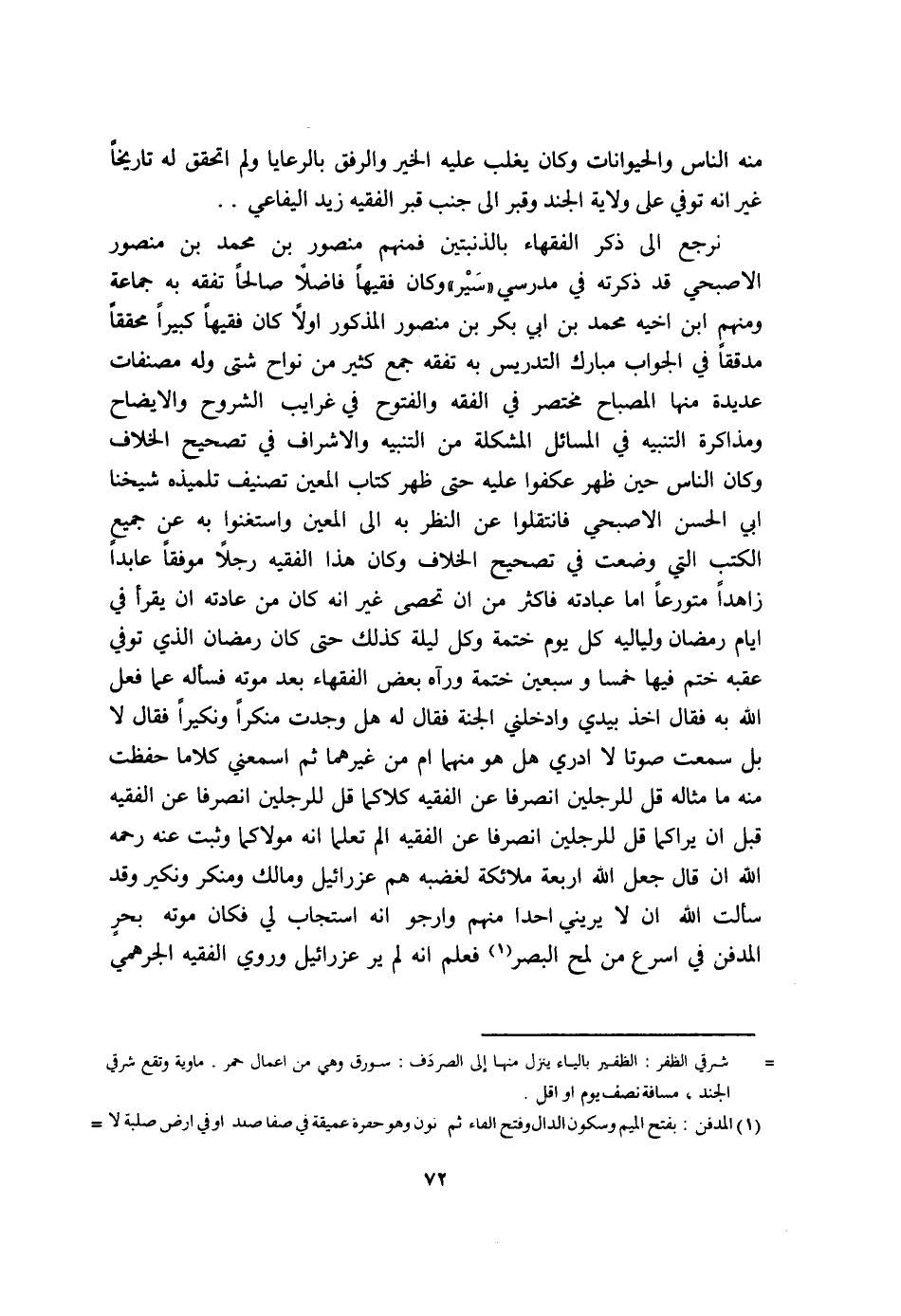 نرْجِع الى ذكر الْفُقَهَاء بالذنبتين فَمنهمْ مَنْصُور بن مُحَمَّد بن مَنْصُور الاصبحي قد ذكرته فِي مدرسي سير وَكَانَ فَقِيها فَاضلا صَالحا تفقه بِهِ جمَاعَة وَمِنْهُم ابْن اخيه مُحَمَّد بن ابي بكر بن مَنْصُور الْمَذْكُور اولا كَانَ فَقِيها كَبِيرا محققا مدققا فِي الْجَواب مبارك التدريس بِهِ تفقه جمع كثير من نواح شَتَّى وَله مصنفات عديدة مِنْهَا الْمِصْبَاح مُخْتَصر فِي الْفِقْه والفتوح فِي غرايب الشُّرُوح والايضاح ومذاكرة التَّنْبِيه فِي الْمسَائِل المشكلة من التَّنْبِيه والاشراف فِي تَصْحِيح الْخلاف وَكَانَ النَّاس حِين ظهر عكفوا عَلَيْهِ حَتَّى ظهر كتاب الْمعِين تصنيف تِلْمِيذه شَيخنَا ابي الْحسن الاصبحي فانتقلواعن النّظر بِهِ الى الْمعِين واستغنوا بِهِ عَن جَمِيع الْكتب الَّتِي وضعت فِي تَصْحِيح الْخلاف وَكَانَ هَذَا الْفَقِيه رجلا موفقا عابدا زاهدامتورعا اما عِبَادَته فاكثر من ان تحصى غير انه كَانَ من عَادَته ان يقْرَأ فِي ايام رَمَضَان ولياليه كل يَوْم ختمة وكل لَيْلَة كَذَلِك حَتَّى كَانَ رَمَضَان الَّذِي توفّي عقبه ختم فِيهَا خمْسا وَسبعين ختمة وَرَآهُ بعض الْفُقَهَاء بعد مَوته فَسَأَلَهُ عَمَّا فعل الله بِهِ فَقَالَ أَخذ بيَدي وادخلني الْجنَّة فَقَالَ لَهُ هَل وجدت مُنْكرا ونكيرا فَقَالَ لَا بل سَمِعت صَوتا لَا ادري هَل هُوَ مِنْهُمَا ام من غَيرهمَا ثمَّ اسمعني كلَاما حفظت مِنْهُ مَا مِثَاله قل للرجلين انصرفا عَن الْفَقِيه كلاكما قل للرجلين انصرفا عَن الْفَقِيه قبل انيراكما قل لِرجلَيْنِ انصرفا عَن الْفَقِيه الم تعلما انه مولاكما وَثَبت عَنهُ رَحمَه الله ان قَالَ جعل الله اربعة مَلَائِكَة لغضبه هم عزرائيل وَمَالك ومنكر وَنَكِير وَقد سَالَتْ الله ان لَا يريني احدا مِنْهُم وارجو انه اسْتَجَابَ لي فَكَانَ مَوته بَحر المدفن فِي اسرع من لمح الْبَصَر فَعلم انه لم ير عزرائيل وَرُوِيَ الْفَقِيه الجرهمي