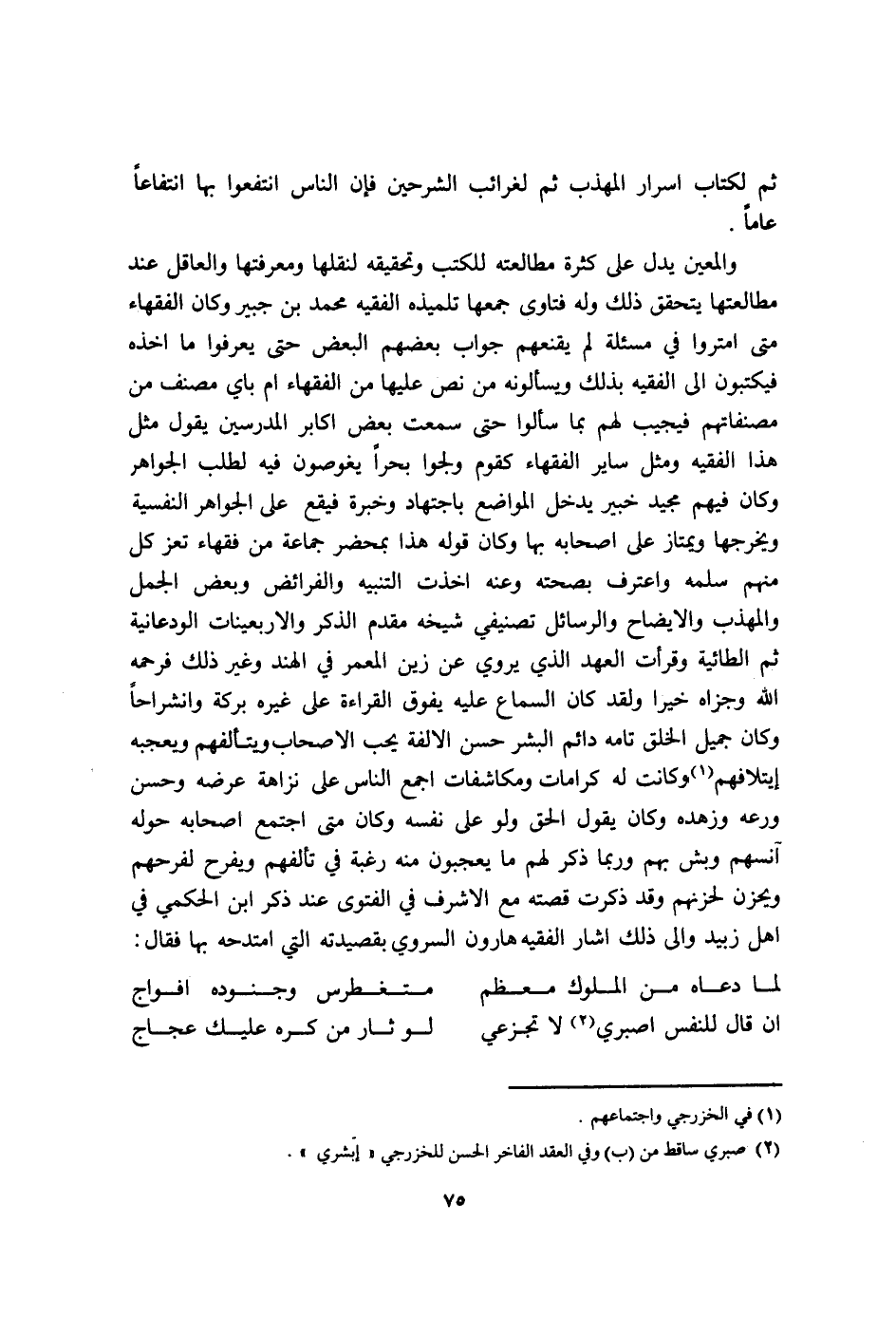 والمعين يدل على كَثْرَة مطالعته للكتب وتحقيقه لنقلها ومعرفتها والعاقل عِنْد مطالعتها يتَحَقَّق ذَلِك وَله فَتَاوَى جمعهَا تِلْمِيذه الْفَقِيه مُحَمَّد بن جُبَير وَكَانَ الْفُقَهَاء مَتى امتروا فِي مسئلة لم يقنعهم جَوَاب بَعضهم الْبَعْض حَتَّى يعرفوا مَا اخذه فيكتبون الى الْفَقِيه بذلك ويسألونه من نَص عَلَيْهَا من الفقهء ام باي مُصَنف من مصنفاتهم فيجيب لَهُم بِمَا سَأَلُوا حَتَّى سَمِعت بعض اكابر المدرسين يَقُول مثل هَذَا الْفَقِيه وَمثل ساير الْفُقَهَاء كقوم ولجوا بحرا يغوصون فِيهِ لطلب الْجَوَاهِر وَكَانَ فيهم مجيد خَبِير يدْخل الْمَوَاضِع بِاجْتِهَاد وخبرة فَيَقَع على الْجَوَاهِر النفسية ويخرجها ويمتاز على اصحابه بهَا وَكَانَ قَوْله هَذَا بِمحضر جمَاعَة من فُقَهَاء تعز كل مِنْهُم سَلمَة واعترف بِصِحَّتِهِ وَعنهُ اخذت التَّنْبِيه والفرائض وَبَعض الْجمل والمهذب والإيضاح والرسائل تصنيفي شَيْخه مقدم الذّكر والاربعينات الودعانية ثمَّ الطائية وقرأت الْعَهْد الَّذِي يروي عَن زين المعمر فِي الْهِنْد وَغير ذَلِك فرحمه الله وجزاه خيرا وَلَقَد كَانَ السماع عَلَيْهِ يفوق الْقِرَاءَة على غَيره بركَة وانشراحا وَكَانَ جميل الْخلق تَامَّة دَائِم الْبشر حسن الالفة يحب الاصحاب ويتألفهم وَيُعْجِبهُ إيتلافهم وَكَانَت لَهُ كرامات ومكاشفات اجْمَعْ النَّاس على نزاهة عرضه وَحسن ورعه وزهده وَكَانَ يَقُول الْحق وَلَو على نَفسه وَكَانَ مَتى اجْتمع اصحابه حوله آنسهم وبش بهم وَرُبمَا ذكر لَهُم مَا يعْجبُونَ مِنْهُ رَغْبَة فِي تألفهم ويفرح لفرحهم ويحزن لحزنهم وَقد ذكرت قصَّته مَعَ الاشرف فِي الْفَتْوَى عِنْد ذكر ابْن الْحكمِي فِي اهل زبيد والى ذَلِك اشار الْفَقِيه هَارُون السروي بقصيدته الَّتِي امتدحه بهَا فَقَالَ ... لما دَعَاهُ من الْمُلُوك مُعظم ... متغطرس وَجُنُوده افواج