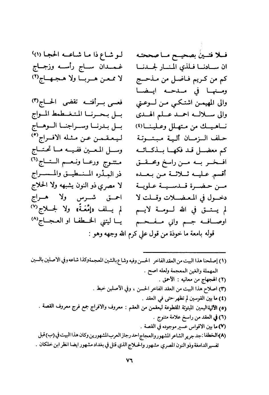 لم يتق فِي الله لومة لايم ... لم يلف إمعة وَلَا لجلاج ... اوصافه جم وَإِنِّي مفحم ... يَا لَيْتَني الخطفا اَوْ العجاج ... قَوْله بامعة ماخوذة من قَول عَليّ كرم الله وَجهه وَهُوَ