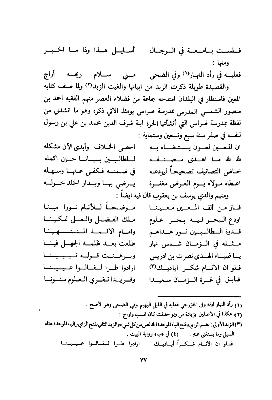 .. فلست بامعة فِي الرِّجَال ... اسايل هَذَا وَذَا مَا الْخَبَر ... وَمِنْهَا ... فَعَلَيهِ فِي رأد النَّهَار وَفِي الضُّحَى ... مني سَلام رِيحه أراج ... وَالْقَصِيدَة طَوِيلَة ذكرت الزّبد من ابياتها والغيت الزّبد وَلما صنف كِتَابه الْمعِين فاستطار فِي الْبلدَانِ امتدحه جمَاعَة من فضلاء الْعَصْر مِنْهُم الْفَقِيه احْمَد بن مَنْصُور الشمسي الْمدرس بمدرسة ضراس يَوْمئِذٍ الَّاتِي ذكره وَهُوَ مَا انشدني من لَفْظَة بمدرسة ضراس الَّتِي أنشأتها الْحرَّة ابْنة شرف الدّين مُحَمَّد بن عَليّ بن رَسُول لنَفسِهِ فِي صفر سنة سبع وَتِسْعين وستماية ... ان الْمعِين لعون يستضاء بِهِ ... احصى الْخلاف وَأبْدى الْآن مشكله
