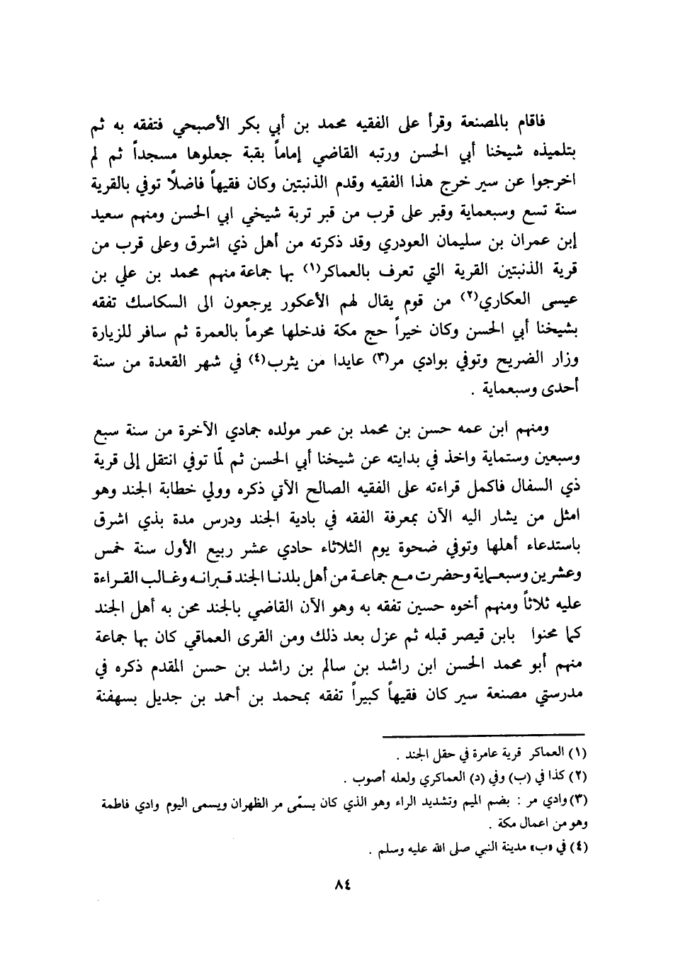 فاقام بالمصنعة وَقَرَأَ على الْفَقِيه مُحَمَّد بن أبي بكر الأصحبي فتفقه بِهِ ثمَّ بتلميذه شَيخنَا أبي الْحسن ورتبة القَاضِي إِمَامًا بَقِيَّة جعلوها مَسْجِدا ثمَّ لم اخْرُجُوا عَن سير خرج هَذَا الْفَقِيه وَقدم الذنبتين وَكَانَ فَقِيها فَاضلا توفّي بالقرية سنة تسع وسبعماية وقبر على قرب من قبر تربة شَيْخي أبي الْحسن وَمِنْهُم سعيد إِبْنِ عمرَان بن سُلَيْمَان العودري وَقد ذكرته من أهل ذِي اشرق وعَلى قرب من قَرْيَة الذنبتين الْقرْيَة الَّتِي تعرف بالعماكر بهَا جمَاعَة مِنْهُم مُحَمَّد بن عَليّ بن عِيسَى العكاري من قوم يُقَال لَهُم الأعكور يرجعُونَ إِلَى السكاسك تفقه بشيخنا أبي الْحسن وَكَانَ خيرا حج مَكَّة فَدَخلَهَا محرما بِالْعُمْرَةِ ثمَّ سَافر للزيارة وزار الضريح وَتُوفِّي بوادي مر عايدا من يثرب فِي شهر الْقعدَة من سنة أحدى وسبعماية