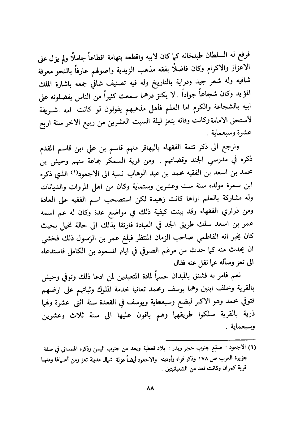 فَرفع لَهُ السُّلْطَان طبلخانه كَمَا كَانَ لابيه واقطعه بتهامة اقطاعا جاملا وَلم يزل على الاعزاز والاكرام وَكَانَ فَاضلا بِفقه مَذْهَب الزيدية واصولهم عَارِفًا بالنحو معرفَة شافية وَله شعر جيد ودراية بالتاريخ وَله فِيهِ تصنيف شافي جمعه باشارة الْملك الْمُؤَيد وَكَانَ شجاعا جوادا