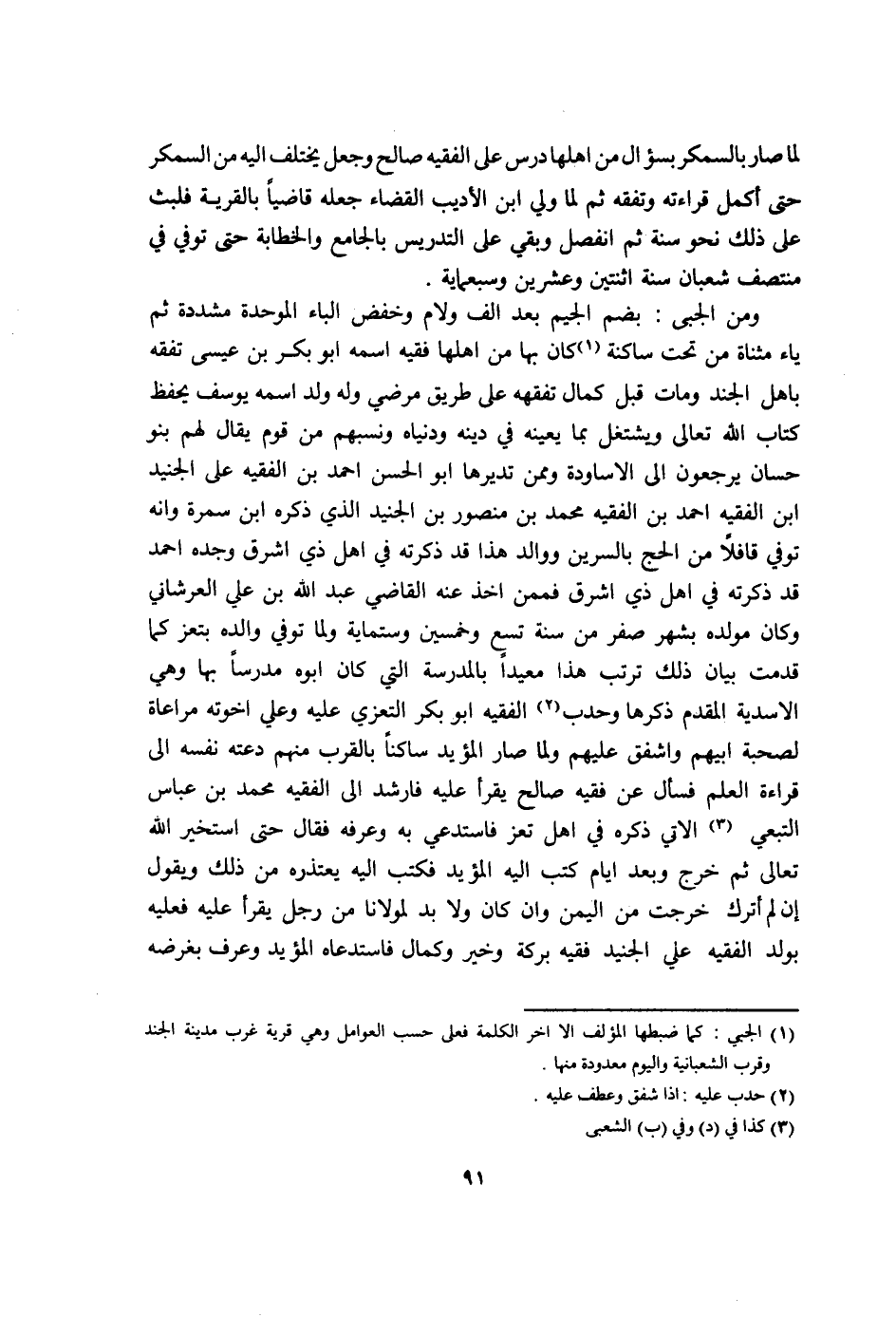 وَمن الجبى بِضَم الْجِيم بعد الف وَلَام وخفض الْبَاء الْمُوَحدَة مُشَدّدَة ثمَّ يَاء مثناة من تَحت سَاكِنة كَانَ بهَا من اهلها فَقِيه اسْمه ابو بكر بن عِيسَى تفقه بَاهل الْجند وَمَات قبل كَمَال تفقهه على طَرِيق مرضِي وَله ولد اسْمه يُوسُف يحفظ كتاب الله تَعَالَى ويشتغل بِمَا يُعينهُ فِي دينه ودنياه ونسبهم من قوم يُقَال لَهُم بَنو حسان يرجعُونَ الى الاساودة وَمِمَّنْ تديرها ابو الْحسن احْمَد بن الْفَقِيه على الْجُنَيْد ابْن الْفَقِيه احْمَد بن الْفَقِيه مُحَمَّد بن مَنْصُور بن الْجُنَيْد الَّذِي ذكره ابْن سَمُرَة وانه توفّي قَافِلًا من الْحَج بالسرين ووالد هَذَا قد ذكرته فِي اهل ذِي اشرق وجده احْمَد قد ذكرته فِي اهل ذِي اشرق فَمِمَّنْ اخذ عَنهُ القَاضِي عبد الله بن عَليّ العرشاني وَكَانَ مولده بِشَهْر صفر من سنة تسع وَخمسين وستماية وَلما توفّي وَالِده بتعز كَمَا قدمت بَيَان ذَلِك ترَتّب هَذَا معيدا بِالْمَدْرَسَةِ الَّتِي كَانَ ابوه مدرسا بهَا وَهِي الاسدية الْمُقدم ذكرهَا وحدب الْفَقِيه ابو بكر التعزي عَلَيْهِ وَعلي اخوته مُرَاعَاة لصحبة ابيهم واشفق عَلَيْهِم وَلما صَار الْمُؤَيد سَاكِنا بِالْقربِ مِنْهُم دَعَتْهُ نَفسه الى قِرَاءَة الْعلم فَسَأَلَ عَن فَقِيه صَالح يقْرَأ عَلَيْهِ فارشد الى الْفَقِيه مُحَمَّد بن عَبَّاس التبعي الَّاتِي ذكره فِي اهل تعز فاستدعي بِهِ وعرفه فَقَالَ حَتَّى استخير الله تَعَالَى ثمَّ خرج وَبعد ايام كتب اليه الْمُؤَيد فَكتب اليه يعتذره من ذَلِك وَيَقُول إِن لم أترك خرجت من الْيمن وان كَانَ وَلَا بُد لمولانا من رجل يقرا عَلَيْهِ فَعَلَيهِ بِولد الْفَقِيه عَليّ الْجُنَيْد فَقِيه بركَة وَخير وَكَمَال فاستدعاه الْمُؤَيد وَعرف بغرضه