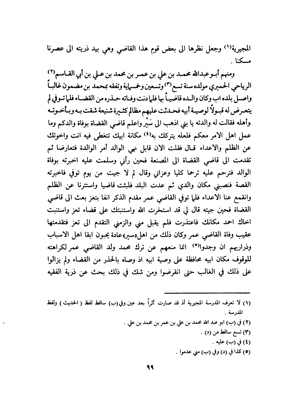 وَمِنْهُم أَبُو عبد الله مُحَمَّد بن عَليّ بن عمر بن مُحَمَّد بن عَليّ بن أبي الْقَاسِم الريَاحي الْحِمْيَرِي مولده سنة تسع وَتِسْعين وخمسماية وتفقه بِمُحَمد بن مَضْمُون غَالِبا وَاصل بَلَده اب وَكَانَ وَالِده قَاضِيا بهَا فَلَمَّا دنت وَفَاته حذره من الْقَضَاء فَلَمَّا توفّي لم يتَعَرَّض لَهُ قبولا لوَصِيَّة أَبِيه فَحدثت عَلَيْهِم مظالم كَثِيرَة شنيعة شقَّتْ بِهِ وبأخوته وَأَهله فَقَالَت لَهُ والدته يَا بني اذْهَبْ الى سير وَاعْلَم قَاضِي الْقُضَاة بوفاة والدكم وَمَا عمل اهل الامر مَعكُمْ فَلَعَلَّهُ يتركك بِهِ مكانة ابيك تتغطى فِيهِ انت واخوتك عَن الظُّلم والاعداء قَالَ فَقلت الان قَابل نهي الْوَالِد أَمر الوالدة فتعارضا ثمَّ تقدّمت الى قَاضِي الْقُضَاة الى المصنعة فحين رأني وسلمت عَلَيْهِ اخبرته بوفاة الْوَالِد فترحم عَلَيْهِ ترحما كليا وعزاني وَقَالَ لم لَا جيت من يَوْم توفّي فاخبرته الْقِصَّة فنصبني مَكَان وَالِدي ثمَّ عدت الْبَلَد فَلَبثت قَاضِيا واستترنا عَن الظُّلم وانقمع عَن الاعداء فَلَمَّا توفّي القَاضِي عمر مقدم الذّكر انفا بتعز بعث الى قَاضِي الْقُضَاة فحين جيته قَالَ لي قد استخرت الله واستنبتك على قَضَاء تعز واستنبت اخاك احْمَد مَكَانك فاعتذرت فَلم يقبل مني والزمني التَّقَدُّم الى تعز فتقدمتها عقيب وَفَاة القَاضِي عمر وَكَانَ ذَلِك من اهل سير عَادَة يحبونَ ابقا اهل الْأَسْبَاب وذراريهم ان وجدوا أَنما مَنعهم عَن ترك محم دولد القَاضِي عمر لكراهته للوقوف مَكَان ابيه مُحَافظَة على وَصِيَّة ابيه اذ وصاه بالحذر من الْقَضَاء وَلم يزَالُوا على ذَلِك فِي الْغَالِب حَتَّى انقرضوا وَمن شكّ فِي ذَلِك بحث عَن ذُرِّيَّة الْفَقِيه