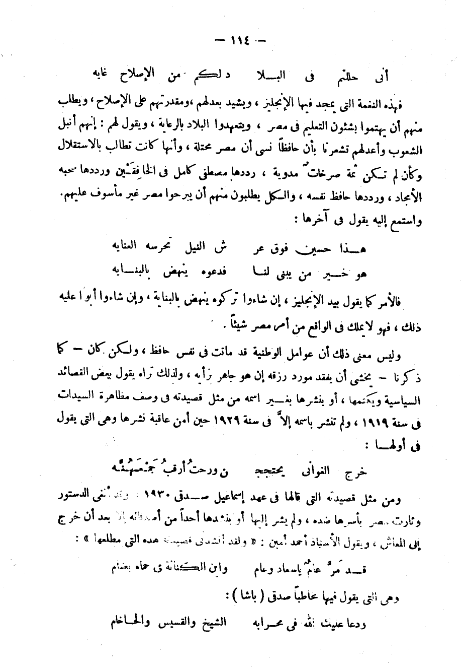 وغير ذلك من القصائد الاجتماعية العديدة التي سنعود إليها بالتفصيل فيما بعد إن شاء الله، وقد تأثر في موقفه مع الإنجليز برأي أستاذه فيهم، فتراه يردد تلك النغمة التي كان يرددها محمد عبده -على الرغم من وطنيته- نغمة الإعجاب بهم، والإطراء لمزاياهم:
