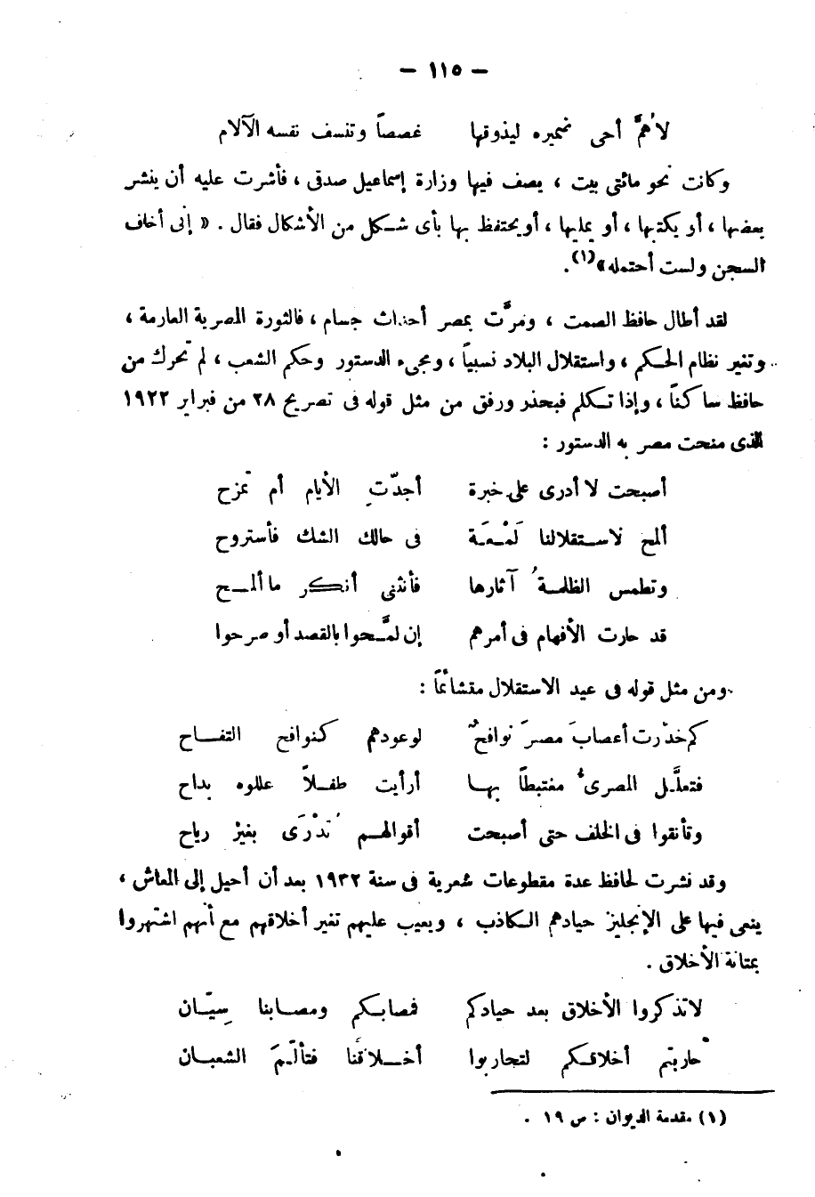 ولا يكتفي بمجرد إعجابه بهم، ودعوته المصريين إلى تقليدهم، والتطلع إلى ما يحتلونه من مكانة بين أمم الأرض، ولو فعل ذلك لكان ولا شك غير ملوم على ثنائه عليهم، ولكنه يشيد بما عملوا من إصلاح في مصر، ويردد ما قاله كرومر في خطبة وداعة من المن على مصر بإصلاحاته. استمع إليه يودع كرومر الداهية وكيف يثني عليه، وإذا تذكرنا أن كرومر كان مكروهًا من عباس، وأنه صديق محمد عبده لا تعجب لموقف حافظ:
