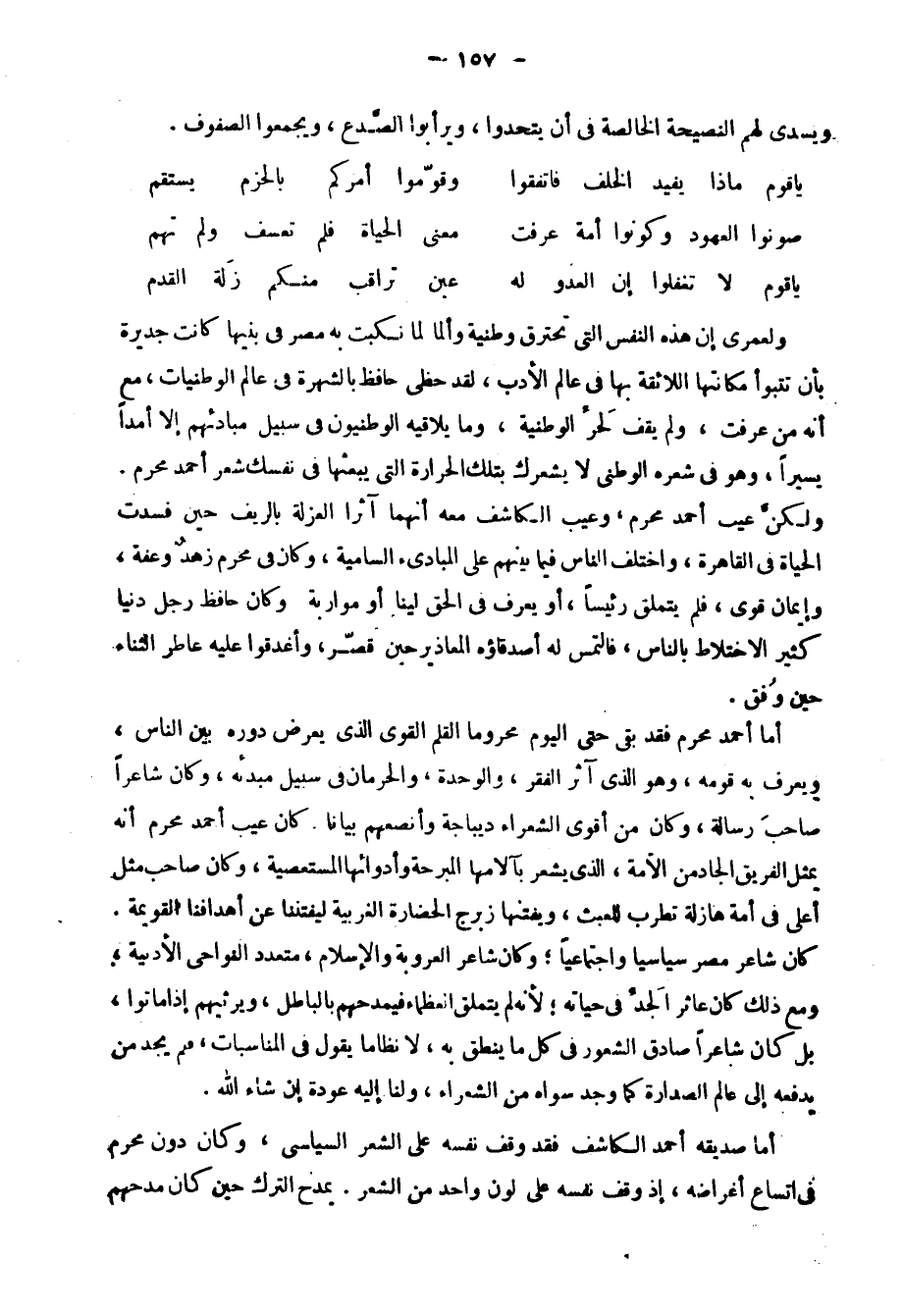 ولقد أردت بذكر شيء عن ولي الدين يكن في هذا المقام أن أعطي صورة واضحة لتأثير السياسة في الشعر، وأن واجبي وأنا أؤرخ هذه الحقبة ألا أهمل أدبيًا تعود الناس إهماله لأنه انحرف عن جادة الحق. لقد نجح الإنجليز بعض النجاح في جذب بعض الأقلام إليهم، وقد كاد حافظ إبراهيم ألا يحظى بلقب شاعر النيل، وأن يكون بوقًا من أبواقهم، لولا موت أستاذه محمد عبده، ولولا أنه مصري فيه بقية من خير جعلته يستجيب لدعاة الوطنية الصحيحة. أما ولي الدين يكن فلم يكن مصريًّا كامل المصرية، وكان مصريًّا بالوطن والإقامة تركيا بالمولد والجنس والعاطفة، وكانت الحرية التي يدعو إليها حرية مصر وتمتعها باستقلالها التام خالصًا دون الترك والإنجليز، بل هي حرية القول، والخوض في تركيا والدعوة إلى أن تظل مصر مفيدة بِغُلَّيْنِ. الغل التركي والغل الإنجليزي، وهذا لعمري خلط في فهم الأشياء وتسميتها بغير أسمائها الصحيحة.